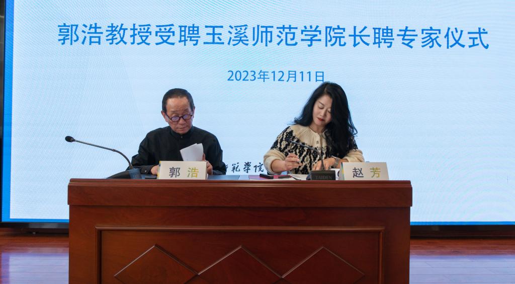 玉溪师范学院美术学院院长赵芳代表学校与郭浩教授签署外聘专家聘任协议。