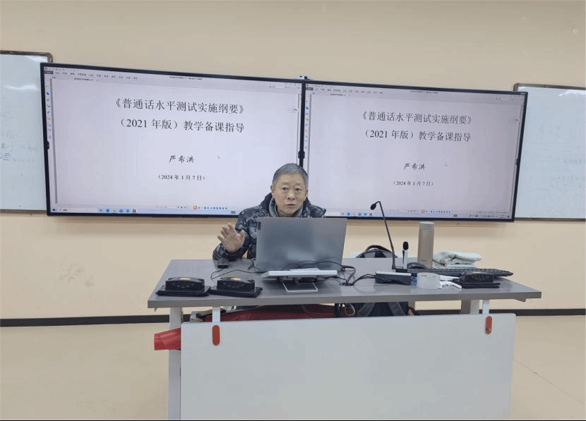 开展普通话水平测试是推广普及国家通用语言文字、提高普及质量的重要措施。2023年8月《普通话水平测试实施纲要(2021年版)》公开发行,自2024年1月1日起正式实施。1月7日上午,玉溪师范学院语委办特邀国家级普通话水平测试员,云南省普通话培训测试中心复审专家组成员、培训专家严希洪老师到校围绕新版纲要开展专题培训。培训会由语委办主任曹冰雪主持,学校全体测评员及普通话任课教师参加培训。