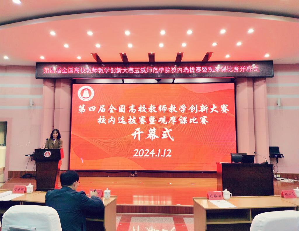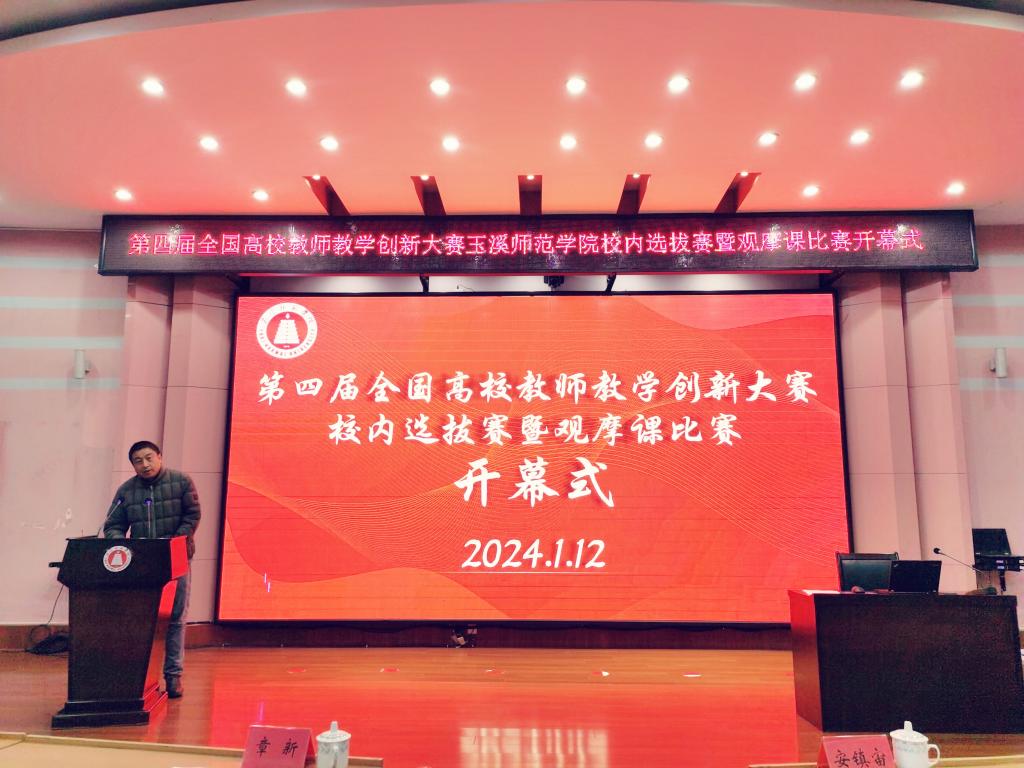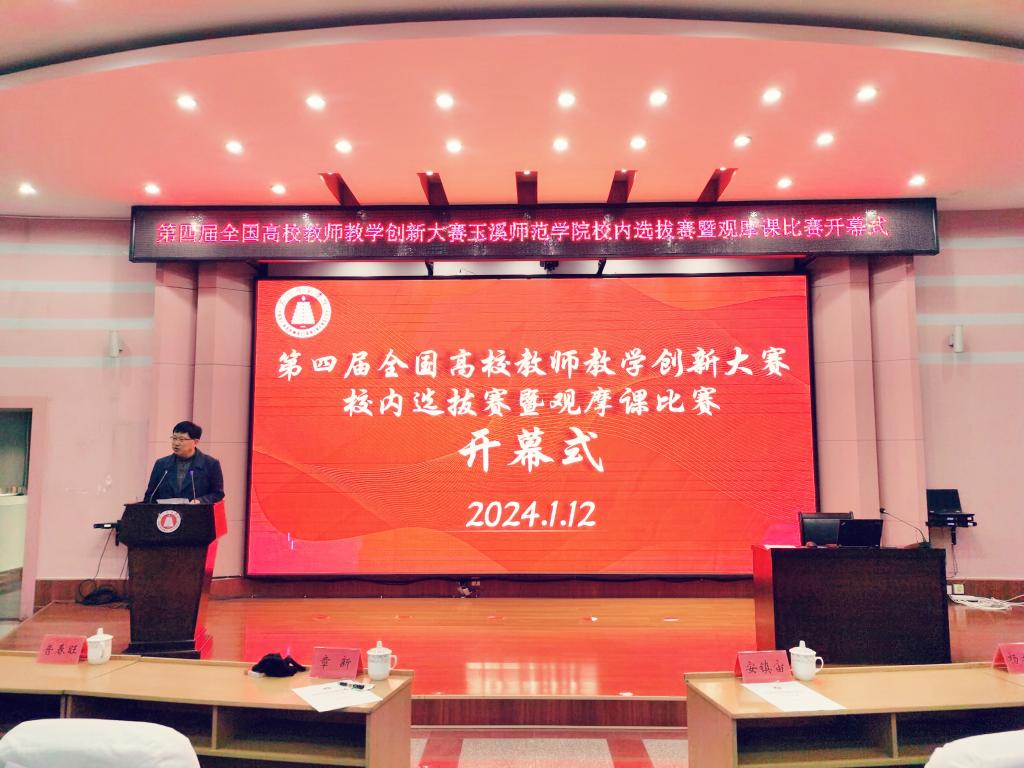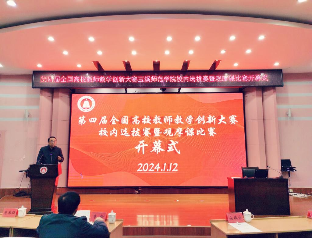 1月12日上午,第四届全国高校教师教学创新大赛玉溪师范学院校内选拔赛暨观摩课比赛开幕式在学校科学讲堂举行。副校长章新出席并致辞,组委会、评委、参赛选手及工作人员参加开幕式。教务处处长安镇宙主持。
