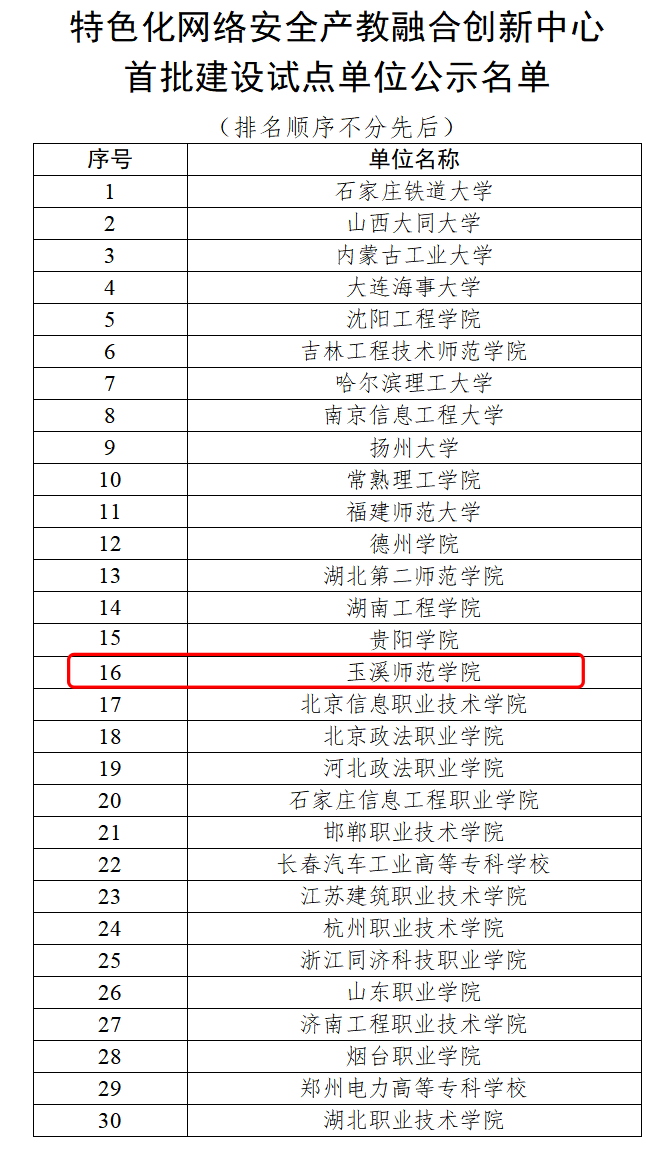 依据《关于公开征集特色化网络安全产教融合创新中心建设试点的通知》,工业和信息化部网络安全产业发展中心于2024年1月5日,对全国179所申报院校进行了初评,并于1月16日进行了终评。经专家评审,玉溪师范学院、常熟理工学院、哈尔滨理工大学等30所院校脱颖而出,成功入围工信部特色化网络安全产教融合创新中心首批建设试点单位。此次入围,标志着我校在信息安全领域的教学、科研和产教融合工作取得了重要突破。