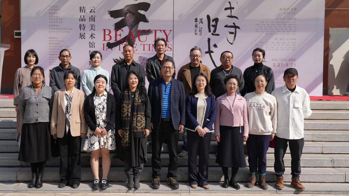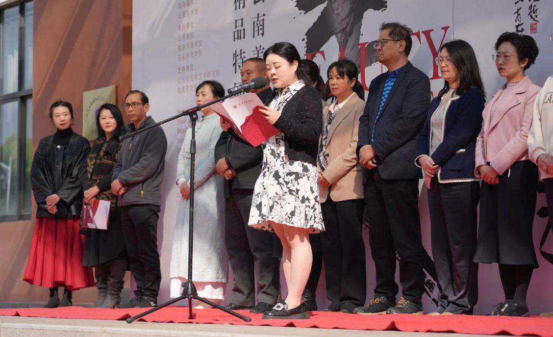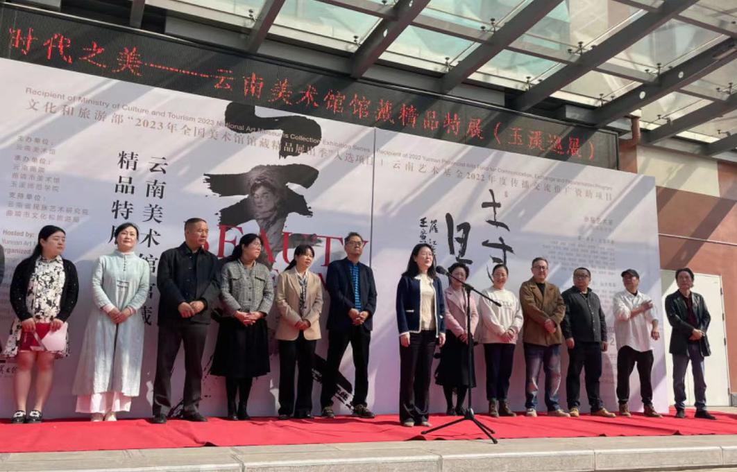 玉溪师范学院党委副书记杨光宣布“时代之美—云南美术馆馆藏精品特展”开展。玉溪师范学院美术学院院长赵芳致辞。她表示,展出作品充分体现出云南各族人民在党的领导下,奋发昂扬的精神面貌与生态文明建设的显著成效。她希望此次展览能发挥美术作品以美育人、以美化人的积极作用,把展览馆变成一个大课堂,让观众在身临其境中中增进对艺术的认识和了解。