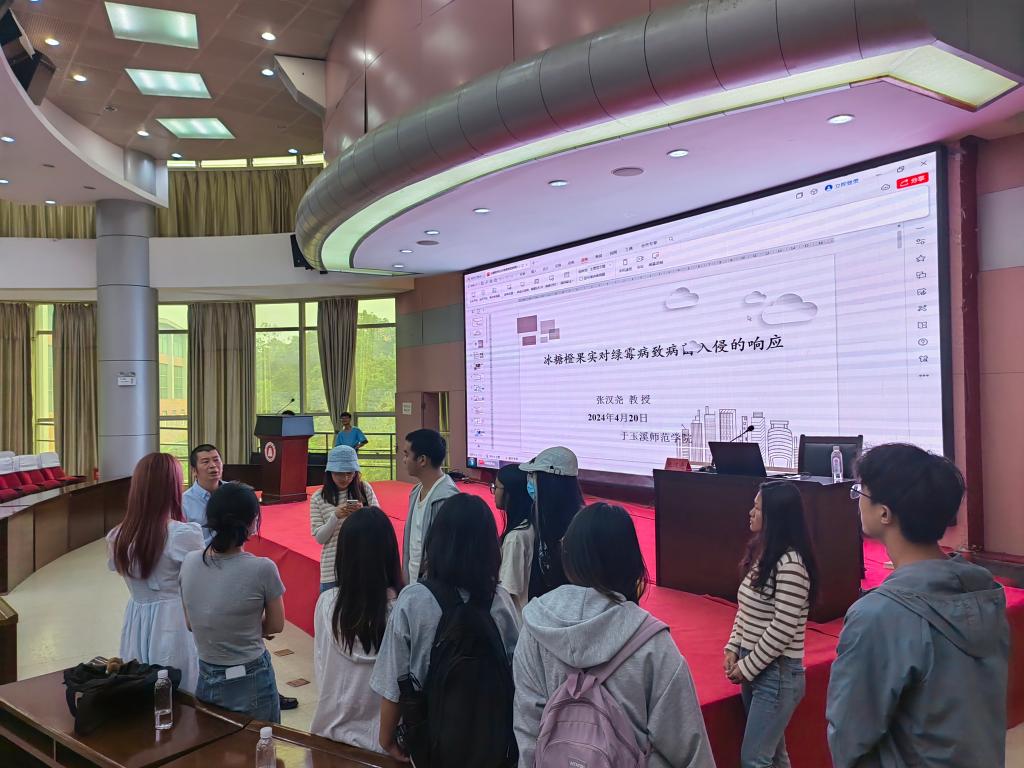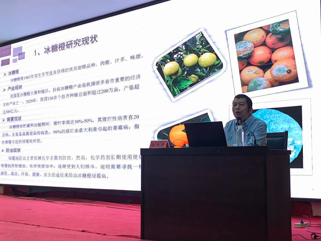 报告会上,张汉尧教授围绕“冰糖橙采后的主要病害对冰糖橙产业的影响”“冰糖橙采后病害目前主要防治方案的优缺点”等方面研究内容,着重介绍了生物信息学、转录组学和代谢组学等前沿技术在探索冰糖橙抗绿霉病基因领域中的应用及取得的成果,对冰糖橙采后病害防治的研究前景进行了展望,并对青年学子投身科学领域、积极研究探索表示欢迎和期待。