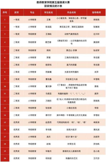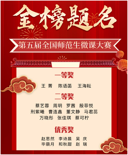 近日,第五届全国师范生微课大赛圆满落幕,玉师学子喜获佳绩。在激烈的竞争中,教师教育学院20名同学在比赛中脱颖而出,荣获一等奖3名、二等奖11名和优秀奖6名的好成绩。