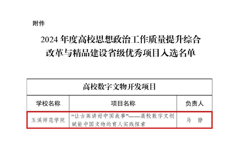 7月1日,中共云南省委教育工委公布2024年度高校思想政治工作质量提升综合改革与精品建设省级优秀项目名单,来自全省高校的16个项目入选。玉溪师范学院美术学院马静老师负责的《“让古画讲好中国故事”——高校数字文创赋能中国文物的育人实践探索》项目,是“高校数字文物开发项目”类别中唯一入选的优秀项目。