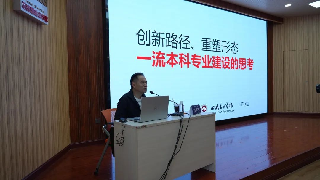 当天下午,四川美术学院教务处处长苏永刚教授以《创新路径 重塑形态 一流专业建设的思考》为题,从人工智能冲击艺术与设计的固有领域展开对一流专业建设的解读与思考,细化分析了专业、课程、教师、教材、质量五个人才培育的基本要素,指导美术学院教师探讨学科与专业建设的创新路径。