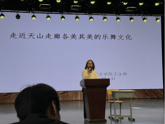 王泳舸教授围绕“走近天山走廊各美其美的乐舞文化”主题,介绍了天山走廊舞蹈文化以及民族人文景观。王泳舸教授指出,我国民族民间舞蹈类型丰富、特色鲜明,是中华民族不可多得的艺术瑰宝。新疆舞蹈文化在各民族长期生产生活实践与精神文明发展进程中具有较强地域性和民族性。每个民族都有该民族最独特、最悠久的舞蹈,就像是该民族的一种象征,充满着独特的民族韵味。