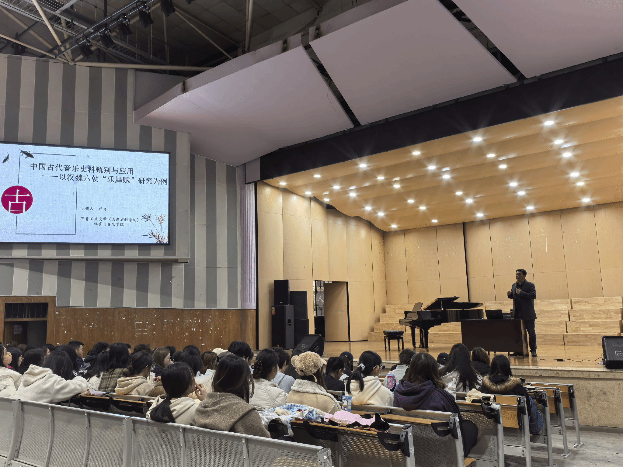 11月7日下午,齐鲁工业大学严可教授、江苏省演艺集团专职作曲赵吉法做客玉溪师范学院“红塔讲坛”,分别为我校师生作题为《中国古代音乐史料甄别与应用——以汉魏六朝“乐舞赋”研究为例》《对民族音乐的理解与创作中的应用》的学术报告。报告会由音乐学院副院长蔡威主持,音乐学院师生200余人参会。