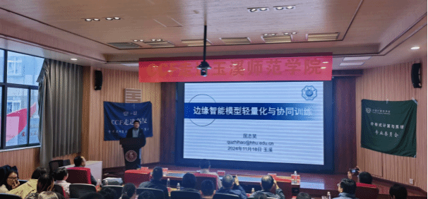 屈志昊副教授的报告从边缘智能协同训练架构、协同训练通信优化和模型轻量化部署三个维度展开,为实现收敛速度快与资源开销低的模型协同提供解决思路。介绍了智能终端设备的泛在普及与物联网应用的蓬勃发展,边缘环境的大规模实时感知数据及丰富的应用场景,指出边缘智能模型的协同训练仍面临诸多挑战,如节点分散异构、协同训练通信开销高、边端设备资源受限等。