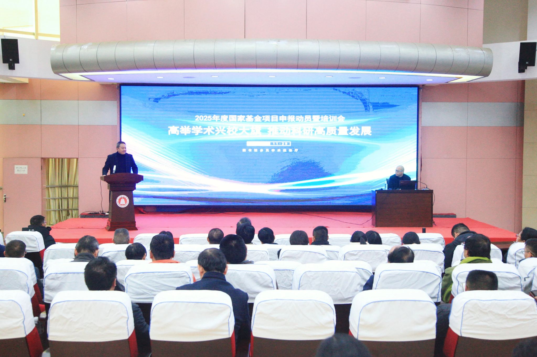 11月29日下午,玉溪师范学院在图书馆多元学术报告厅召开2025年度国家基金项目申报动员暨培训会。校长段红云作动员讲话,云南大学文传浩教授受邀作国家基金项目申报专题辅导。各二级学院分管科研的副院长、科研秘书以及聘任在专业技术岗的教师,各部门博士、教授、副教授参加会议。副校长李明主持会议。