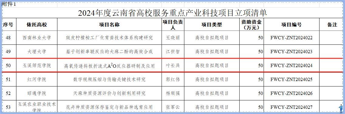 云南省教育厅近日下发2024年度云南省高校服务重点产业科技项目资助通知,玉溪师范学院叶长兵老师主持的项目《高氧传递斜板折流式A2O反应器研制及应用》获得立项,资助经费50万元。