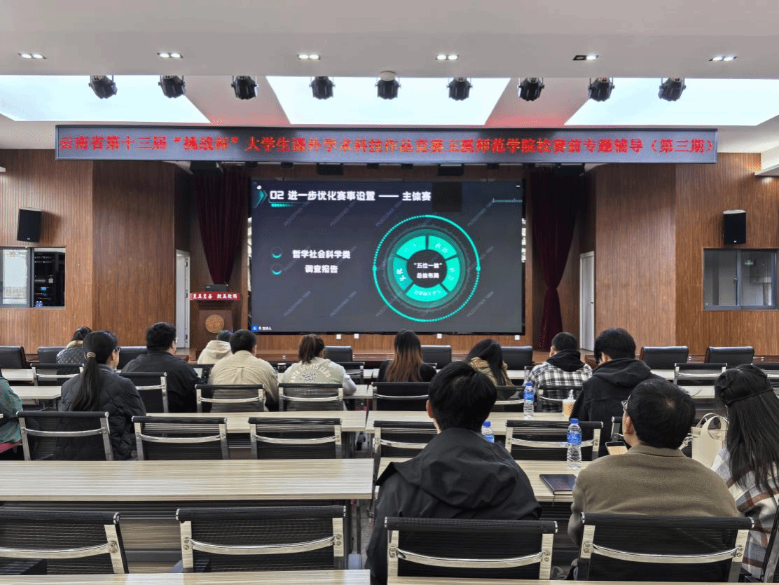4月2日,玉溪师范学院2025年“挑战杯”大学生课外学术科技作品竞赛赛前专题辅导(第三期)在大学生活动中心学生会堂举行。本期辅导由团中央主办、山东大学承办,我校作为省内滇中高校视频分会场参加会议。本次培训会吸引了我校指导教师、参赛选手以及备赛选手参加。
