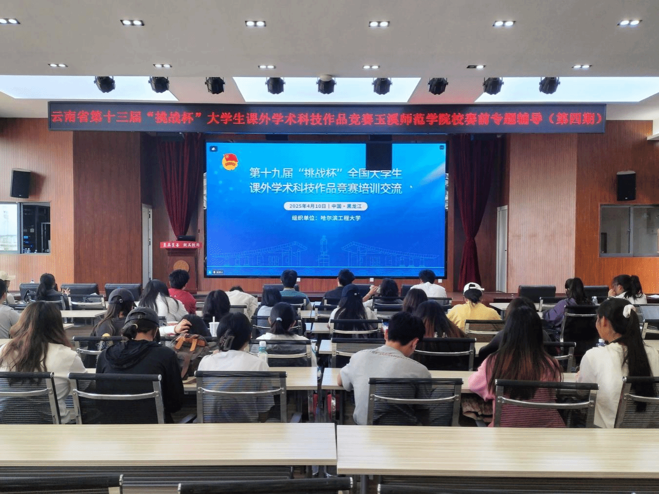 4月10日,玉溪师范学院2025年“挑战杯”大学生课外学术科技作品竞赛赛前专题辅导(第四期)在大学生活动中心学生会堂举行。本期辅导由团中央主办,哈尔滨工程大学承办,我校作为省内滇中高校视频分会场参加会议。本次培训会吸引了我校60余名指导教师、参赛选手以及备赛选手参加。
