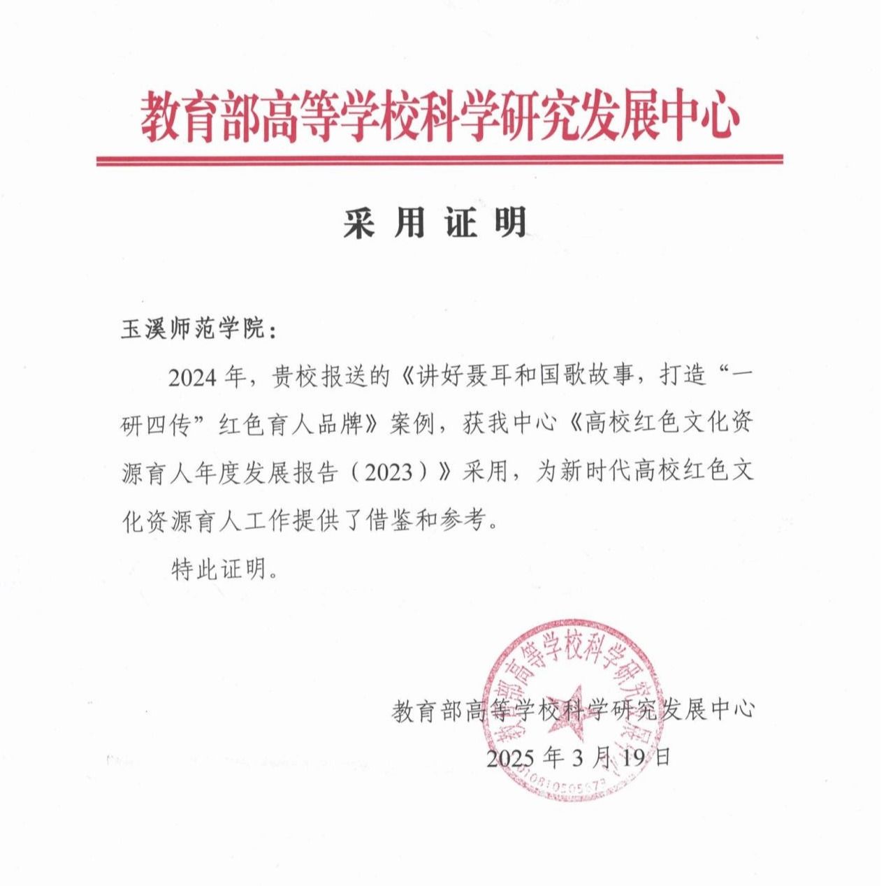 近日,玉溪师范学院收到教育部高等学校科学研究发展中心《采用证明》,我校报送的《讲好聂耳和国歌故事,打造“一研四传”红色育人品牌》案例(负责人:时遂营)被《高校红色文化资源育人年度发展报告(2023)》采用。