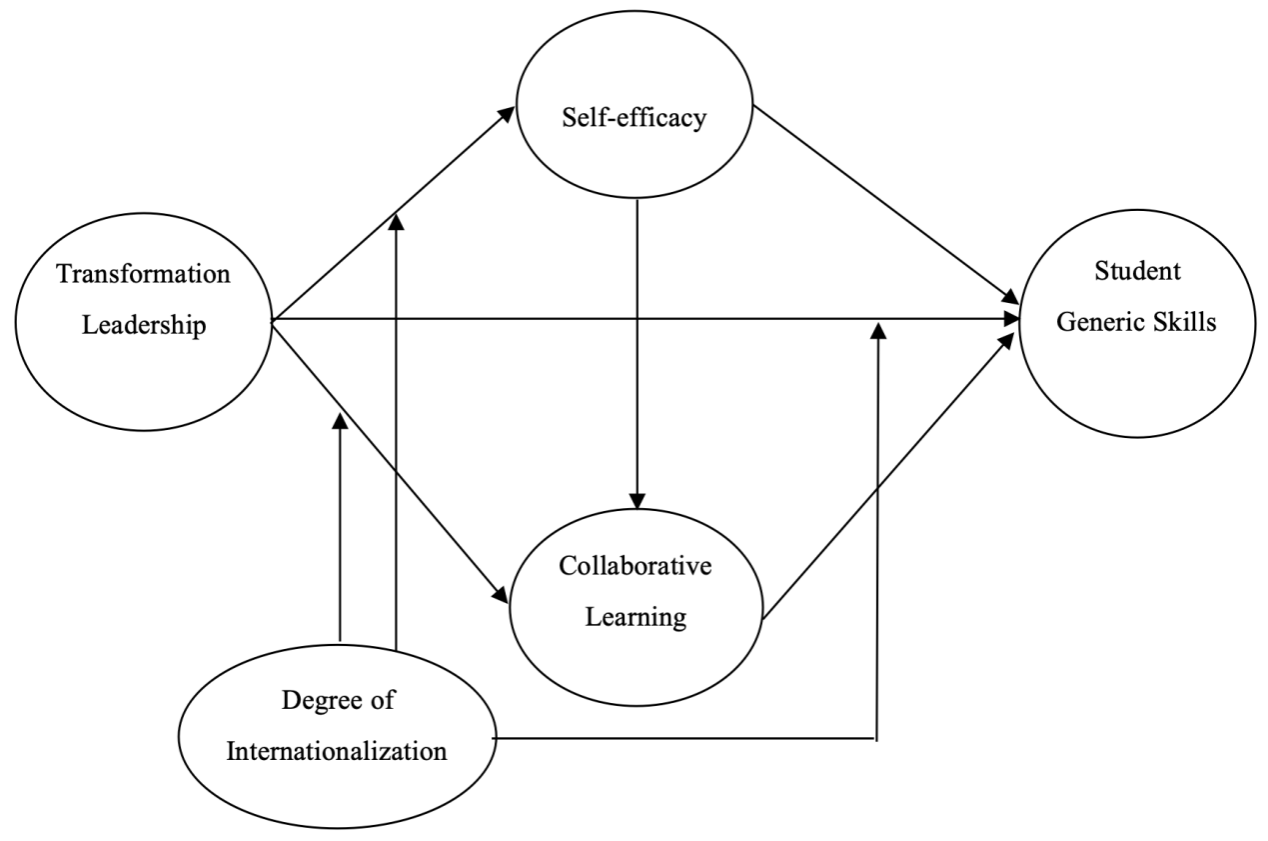 本研究旨在探讨在机构国际化程度的背景下,教师变革型领导风格对483名学生在课堂环境中习得通用技能的影响。本研究借鉴IEO模型,精心设计了一套完整的概念框架,旨在实证验证变革型领导、自我效能、协作学习、通用技能和国际化程度之间的相互关系。本研究通过验证性因子分析(CFA)检验了所有变量的信度和效度,并使用BootStrap的偏最小二乘结构方程模型(PLS-SEM)计算了T值。