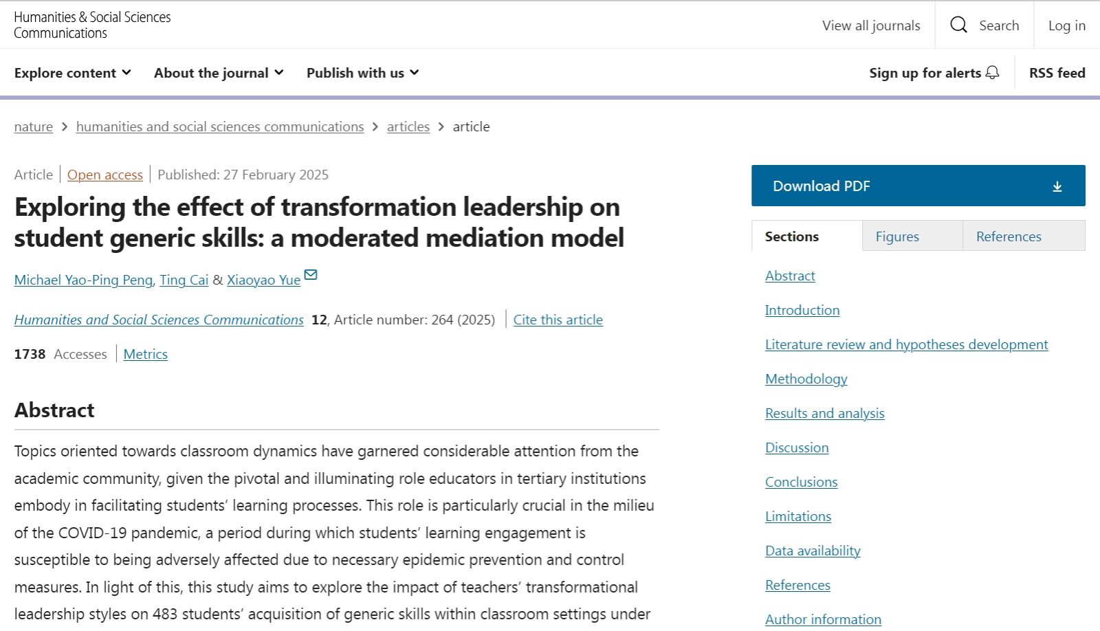 近日,我校教师教育学院青年教师岳小尧以通讯作者、玉溪师范学院为第三单位在Nature子刊Humanities and Social Sciences Communications上发表题为“Exploring the effect of transformation leadership on student generic skills: a moderated mediation model”的研究论文。