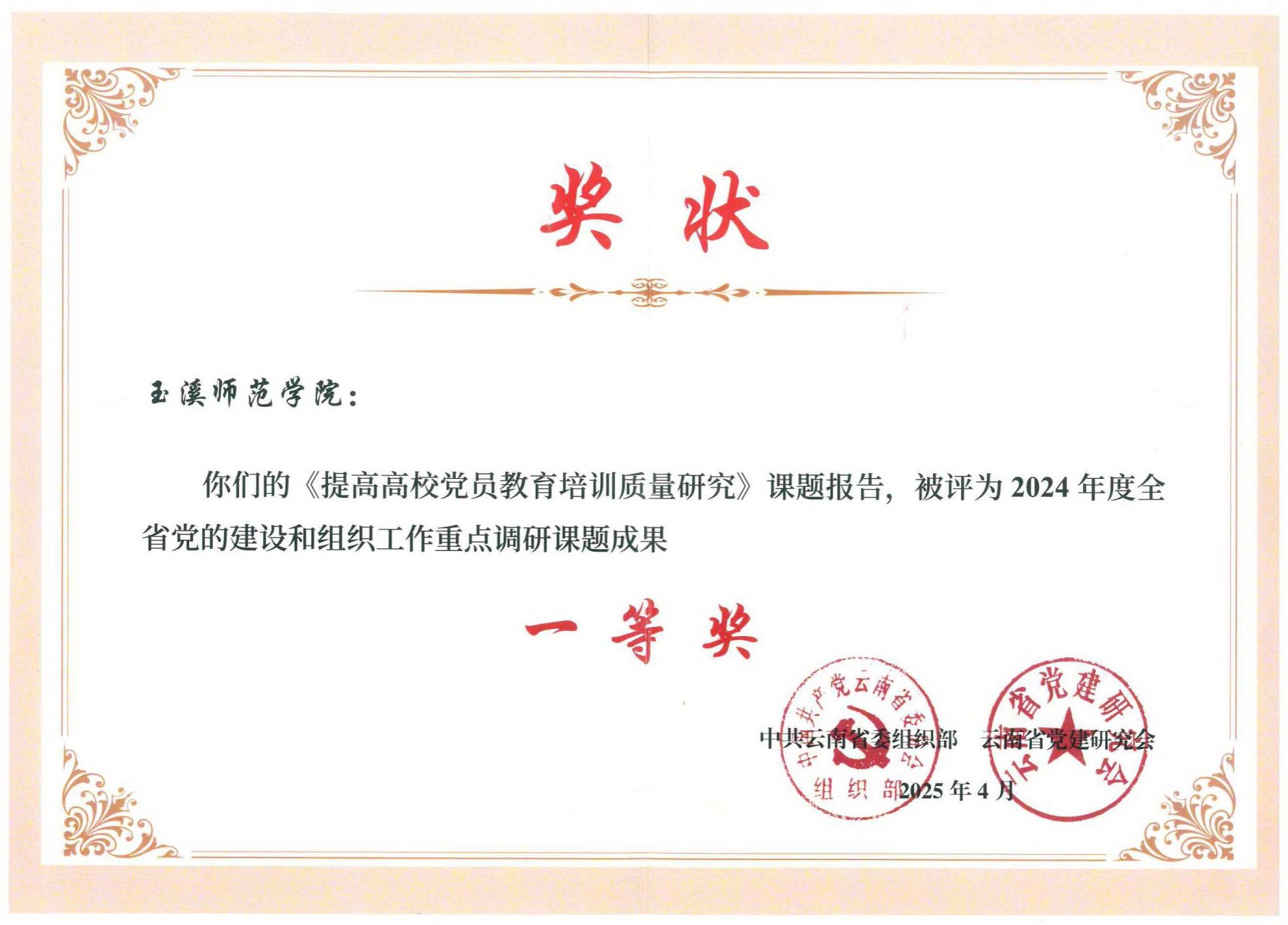 近日,中共云南省委组织部、云南省党建研究会公布了2024年度全省党的建设和组织工作重点调研课题获奖成果。玉溪师范学院党委组织部完成的《提高高校党员教育培训质量研究》获准结题并获评一等奖。