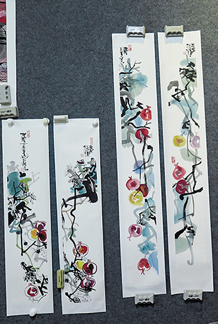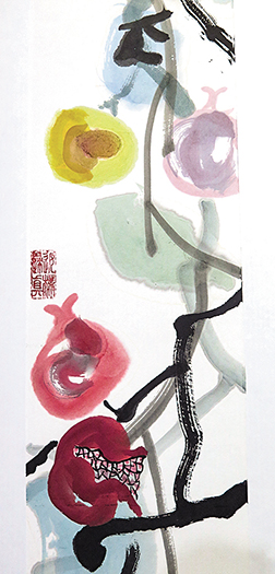 在创作中,他注重色彩微差的运用,或者把草书的表现形式融入石榴绘画中。“草书线条变化无穷,丰富多彩。将草书的激情和严谨在画面中展现,能让画面松弛有度,既有精神内涵,又符合科学性,给人一种舒适感或生命力度感。线条的无穷变化、色彩的冷暖反差和色调的不同处理方式,都能创作出多种多样的石榴绘画作品。所以,我常常会在一幅画没画完时,就迫不及待想画下一幅。”张汉东说。
