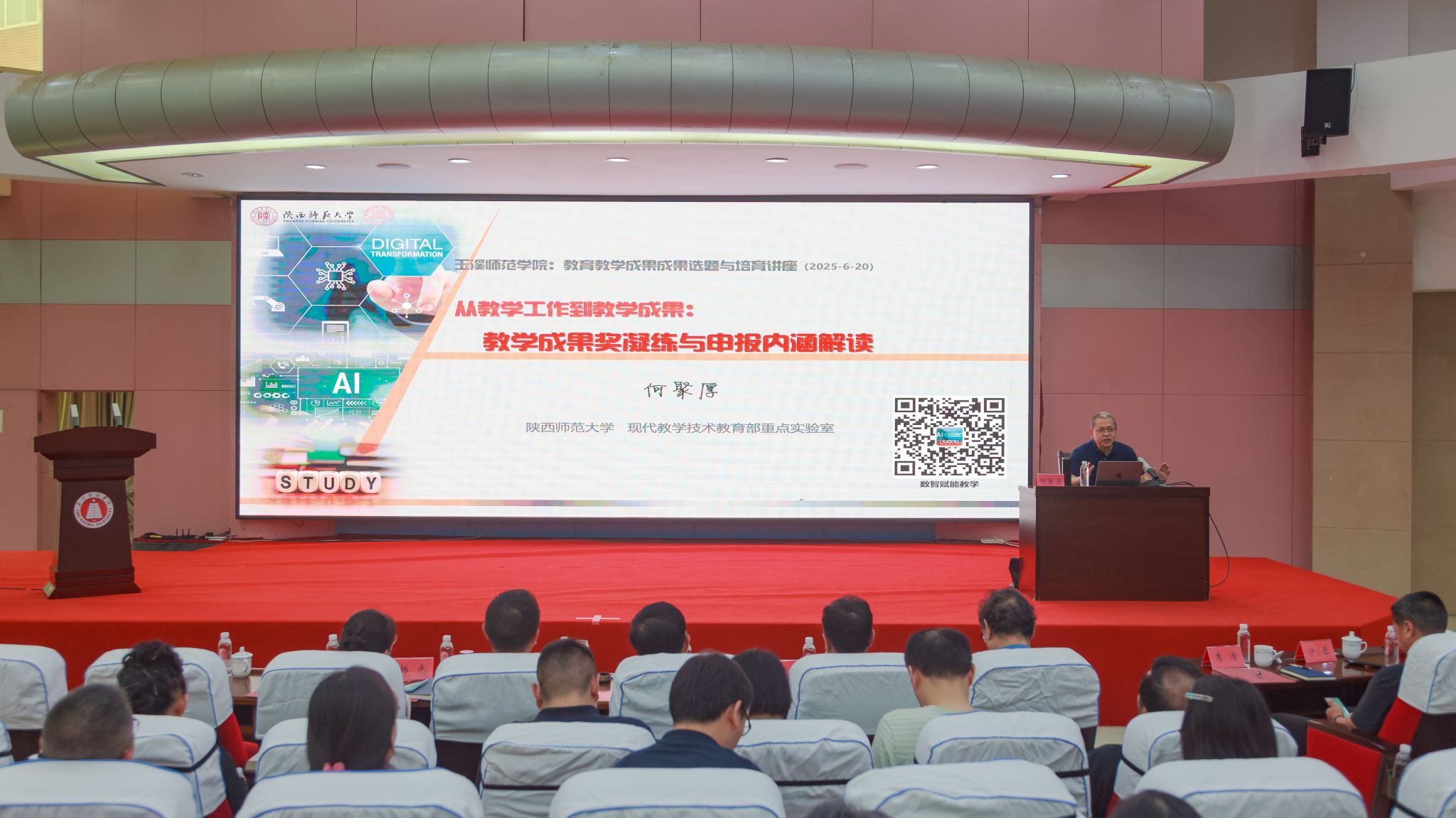 陕西师范大学何聚厚教授作题为《教育数智化转型背景下 “ 人工智能+ 教育 ”教学成果选题与培育》的精彩报告。何教授结合其丰富的教学管理经验和国家级、省级教学成果奖的评审及获奖经历,深入剖析了教学成果奖的凝练和申报书的撰写,为老师们系统规划、培育和申报高水平教学成果提供了极具价值的指导。
