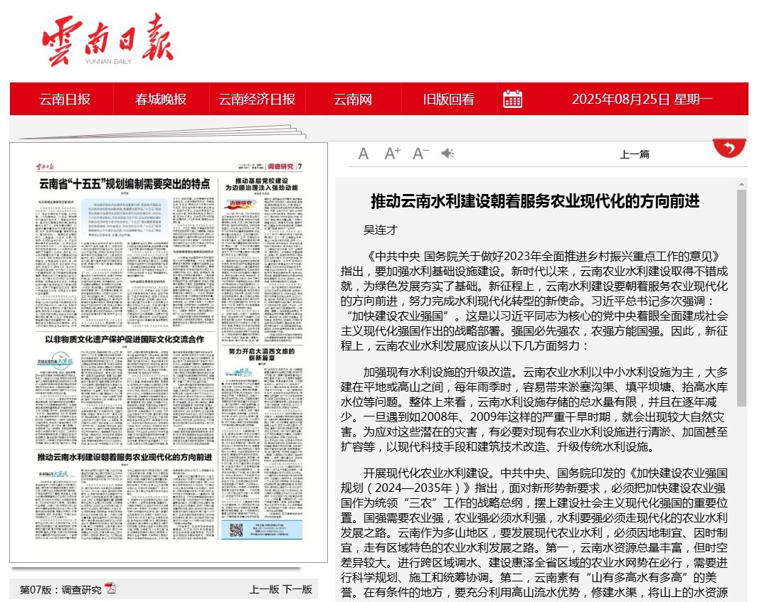 《中共中央 国务院关于做好2023年全面推进乡村振兴重点工作的意见》指出,要加强水利基础设施建设。新时代以来,云南农业水利建设取得不错成就,为绿色发展夯实了基础。新征程上,云南水利建设要朝着服务农业现代化的方向前进,努力完成水利现代化转型的新使命。习近平总书记多次强调:“加快建设农业强国”。这是以习近平同志为核心的党中央着眼全面建成社会主义现代化强国作出的战略部署。强国必先强农,农强方能国强。因此,新征程上,云南农业水利发展应该从以下几方面努力: