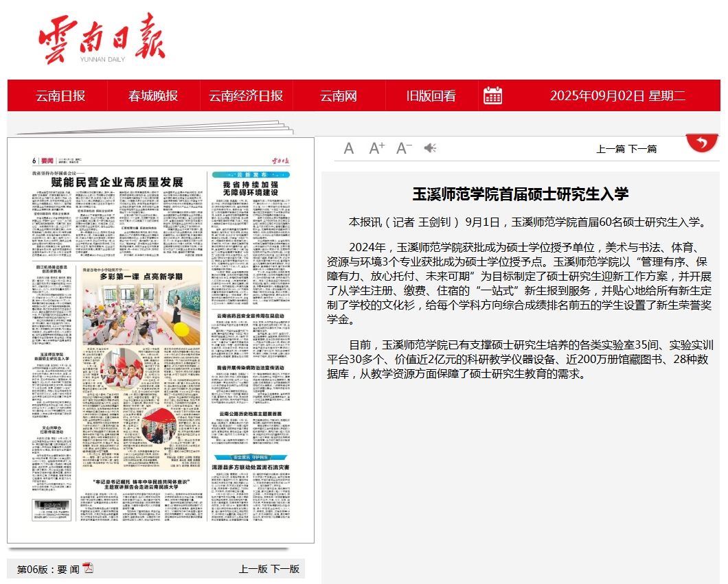 本报讯(记者 王剑钊) 9月1日,玉溪师范学院首届60名硕士研究生入学。