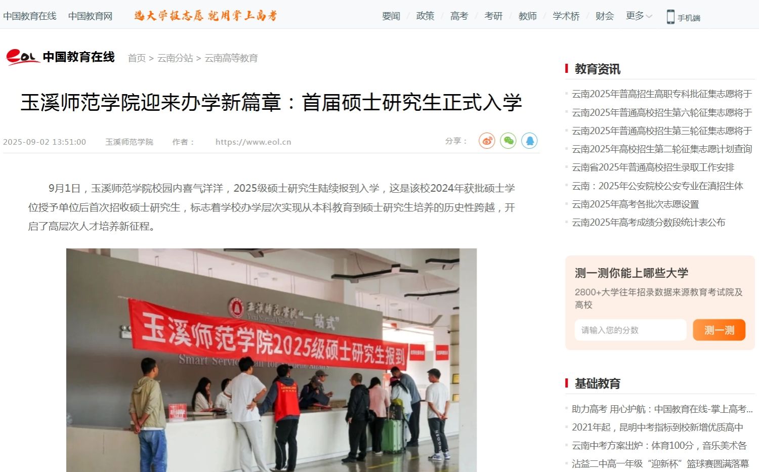 9月1日,玉溪师范学院校园内喜气洋洋,2025级硕士研究生陆续报到入学,这是该校2024年获批硕士学位授予单位后首次招收硕士研究生,标志着学校办学层次实现从本科教育到硕士研究生培养的历史性跨越,开启了高层次人才培养新征程。