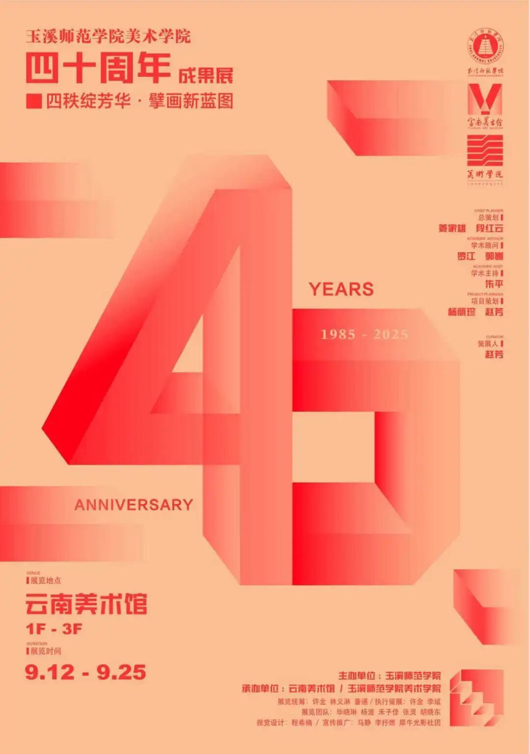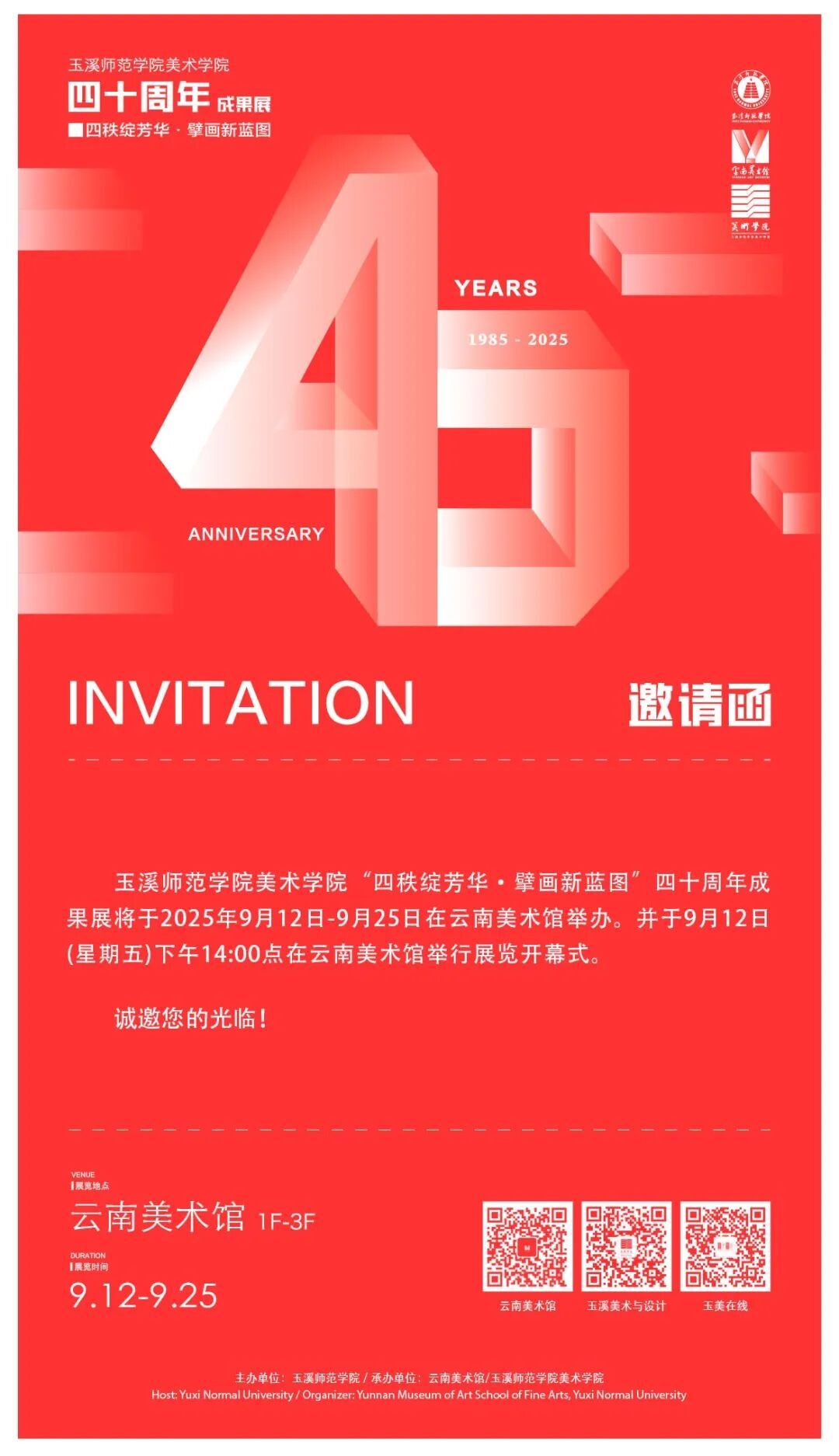 四十年风雨兼程,四十年春华秋实。2025年,玉溪师范学院美术学院迎来四十周年华诞。为全面回顾学院四十年来的办学历程,特举办本次成果展。展览将系统呈现学院在学术研究、艺术创作、人才培养、社会服务等方面的丰硕成果,展现一代代美院人“以艺塑美”的执着追求与“以美育人”的使命担当。