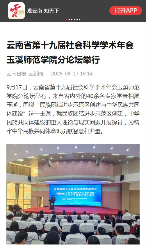 9月17日,云南省第十九届社会科学学术年会玉溪师范学院分论坛举行,来自省内外的40余名专家学者相聚玉溪,围绕“民族团结进步示范区创建与中华民族共同体建设”这一主题,就民族团结进步示范区创建,中华民族共同体建设的重大理论与现实问题开展探讨,为铸牢中华民族共同体意识贡献智慧和力量。