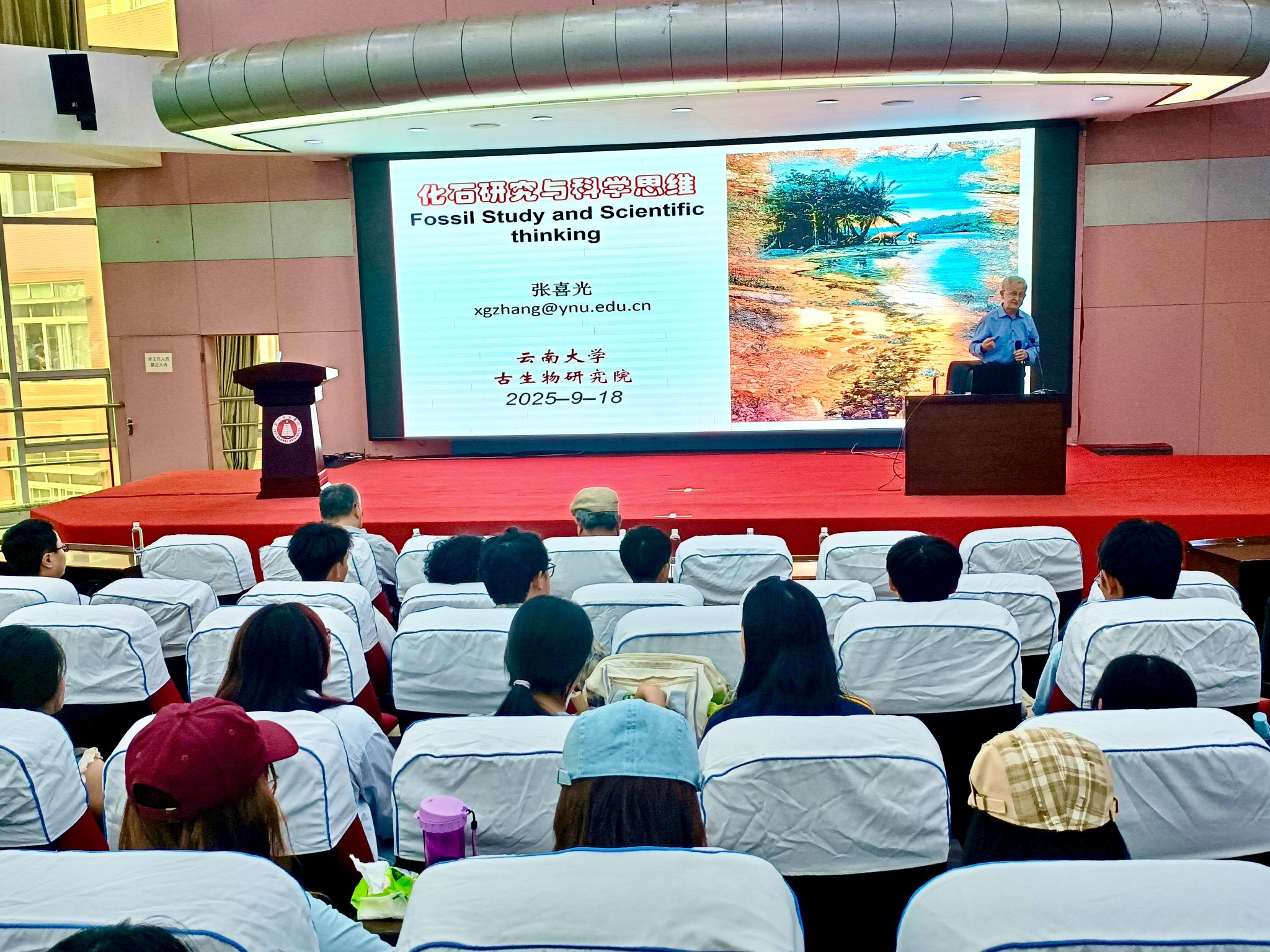 9月18日,云南大学古生物研究院张喜光教授应邀做客玉溪师范学院“红塔讲坛”,带来一场题为《化石研究与科学思维》的精彩学术讲座。地理与国土工程学院、教师教育学院、农学与生物科学学院、商学院、数理学院、工学院、法学院、美术学院、化学与环境工程学院等师生代表、银龄教师以及玉溪市博物馆同仁共400余人参加。