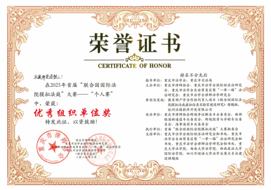 近日,由重庆市法学会、重庆市司法局指导,重庆市律师协会、重庆市法学会国际经济法研究会等联合主办的2025年首届“联合国国际法院模拟法庭”大赛个人赛圆满落幕。玉溪师范学院获“优秀组织单位奖”,充分展现了学校在法学实践教学与国际法人才培养方面的突出成效。