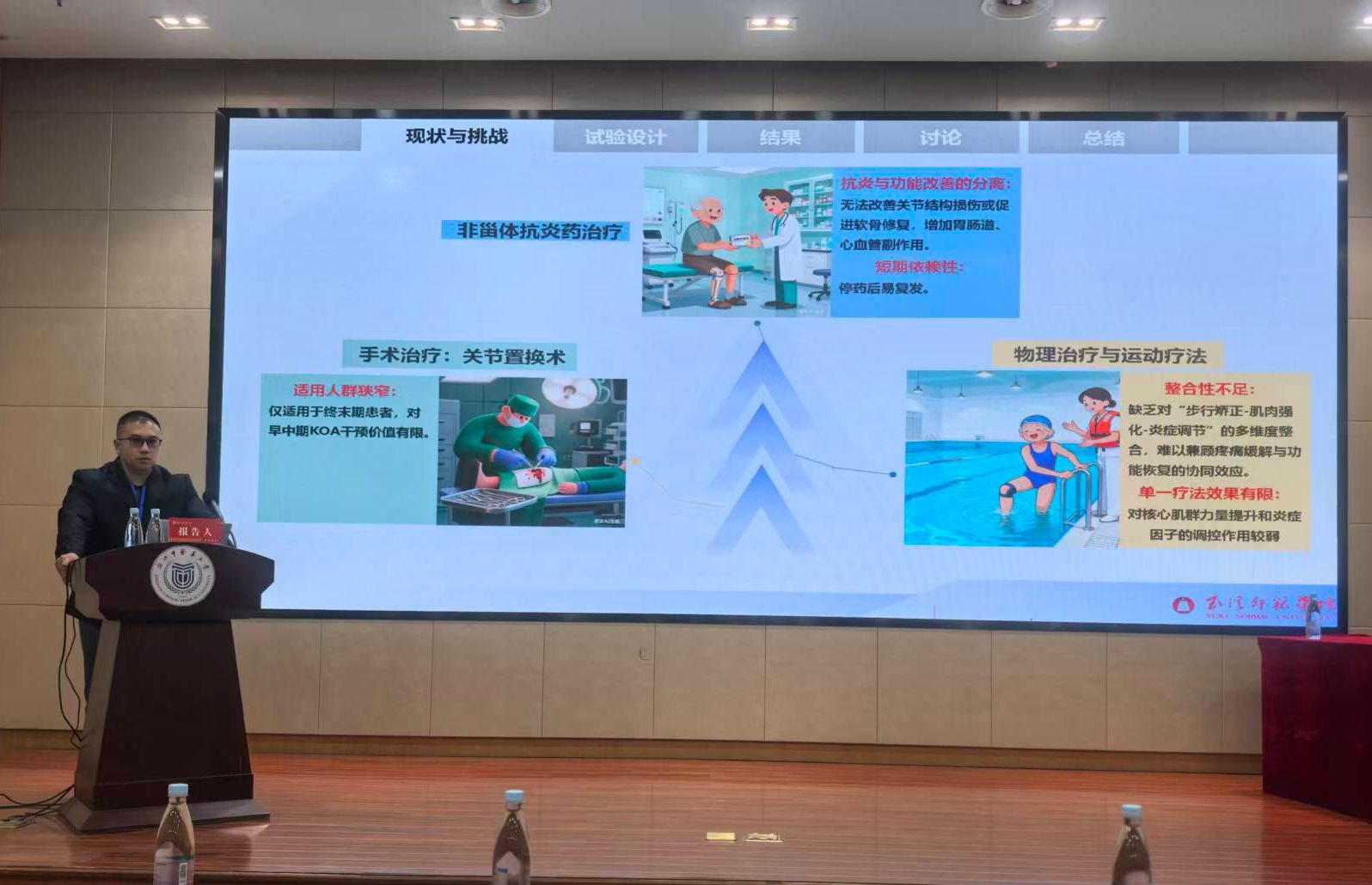 任鹏就最新研究成果 《八段锦结合核心肌群训练辅助膝骨关节炎的恢复》的核心理论构架和临床应用效果进行了演讲和分享,其研究内容为膝骨关节炎非药物治疗的解决方案。