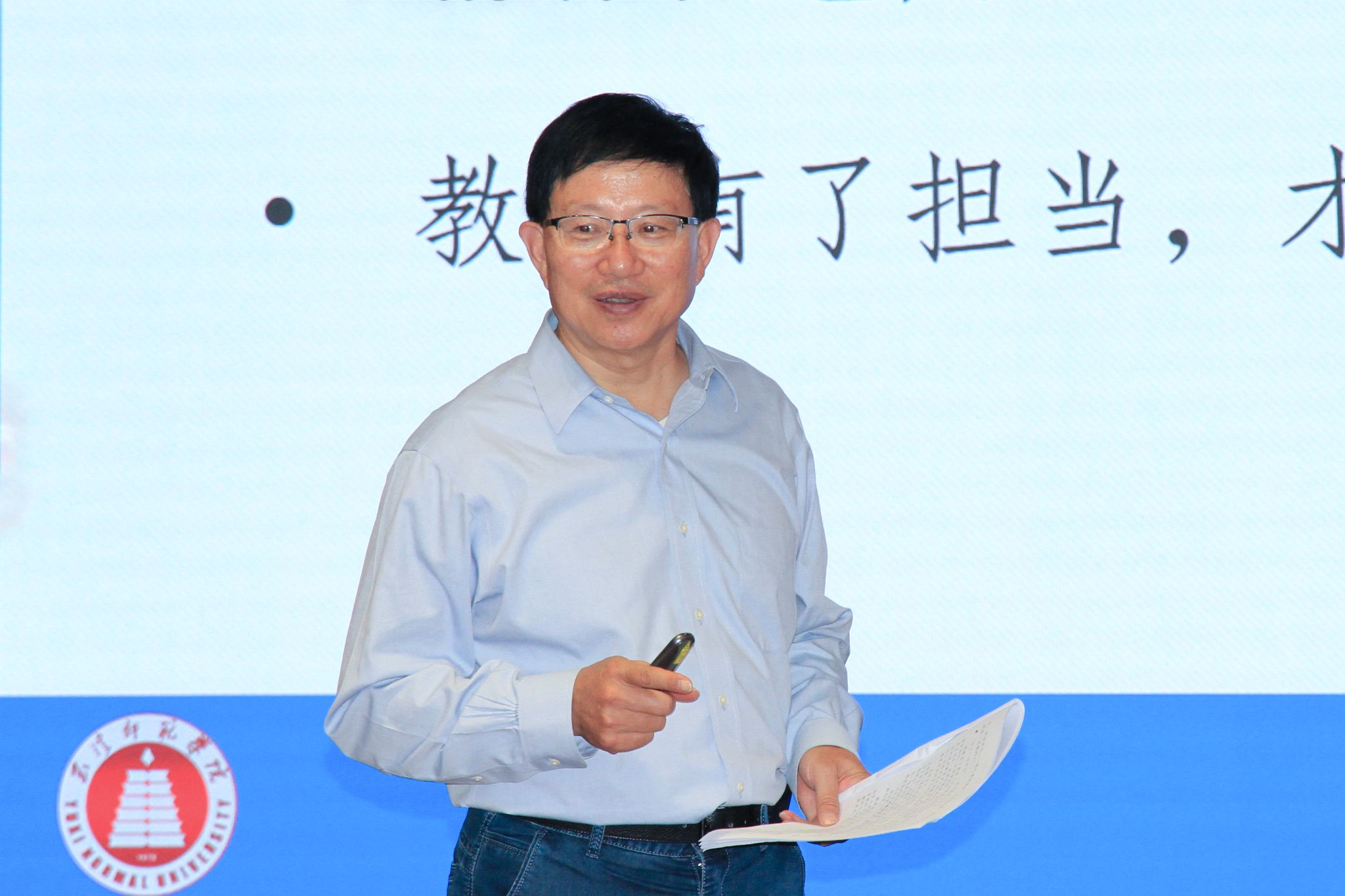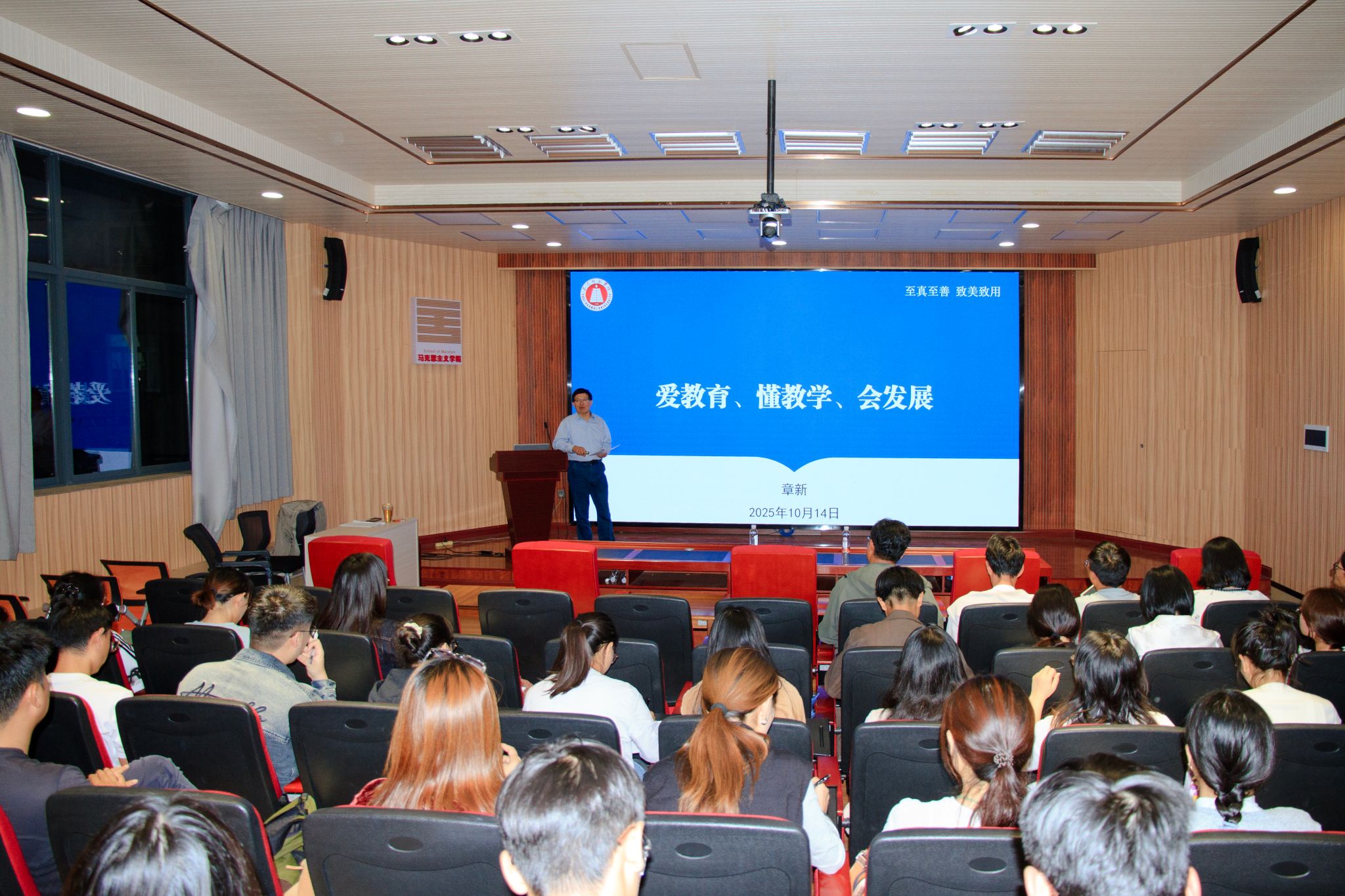 培训现场,章新以幽默风趣的语言与在场新进教师亲切互动,气氛活跃。在“会发展”环节,他以原创诗《杏林有感》作结:“杏叶初黄果参差,阳光雨露沐高枝,滋兰树蕙任评述,春华秋实两相知”,以诗意语言寄语新进教师在教学科研道路上笃定前行,赢得阵阵掌声。