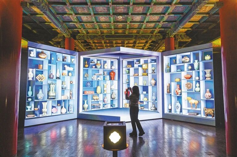 ▲ 9月29日,“百年守护——从紫禁城到故宫博物院”展览开幕式在北京故宫博物院举行。展览展出文物200件(套),立体式阐释中华文明具有的突出的连续性、创新性、统一性、包容性、和平性,全方位展现故宫博物院发展历程。图为观众参观“遇见你的故宫色”裸眼3D数字展。新华社记者 金良快 摄