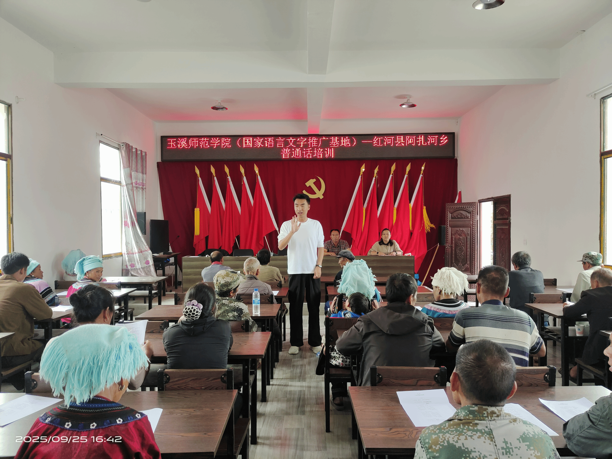 在红河县阿扎河乡政府,团队面向乡镇干部和村民开展培训,助力乡村文化振兴。曹冰雪以“普通话——民族团结的桥梁”为主题,阐述普通话在促进民族交流和乡村振兴中的作用;杨梅结合哈尼族语言文化特点,开展“多语言共生与普通话推广”讲座;刘宪斌采用快板说唱教学法,将普通话声调、儿化音等难点融入《文明红河竹板唱》的表演中;李泽通过《义勇军进行曲》《唱支山歌给党听》等歌词朗读和歌曲教唱,以“音乐+语言”的形式激发学习兴趣。
