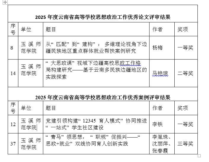 为提升思政工作队伍素质能力,持续优化辅导员队伍建设体系,推动思想政治工作高质量发展,玉溪师范学院积极组织辅导员参加由西南片区高等师范院校和云南省组织的2025年度高等学校思想政治工作优秀论文、优秀案例征集活动,荣获西南片区高等师范院校学生工作研究会论文、案例评选二等奖1项,三等奖1项;云南省一等奖2项、二等奖1项、三等奖1项。