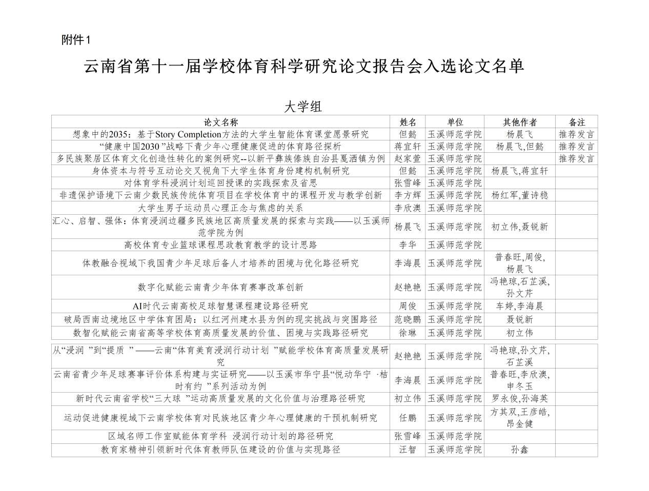 11月1日至2日,由云南省教育厅主办,云南省学校体育教学指导委员会、红河州教育体育局、红河学院共同承办的云南省第十一届学校体育科学论文报告会暨第一届学校美育教育研究论文报告会在红河学院举行。玉溪师范学院师生在学校体育科学研究论文中共获得一等奖3项、二等奖5项、三等奖12项的优异成绩。