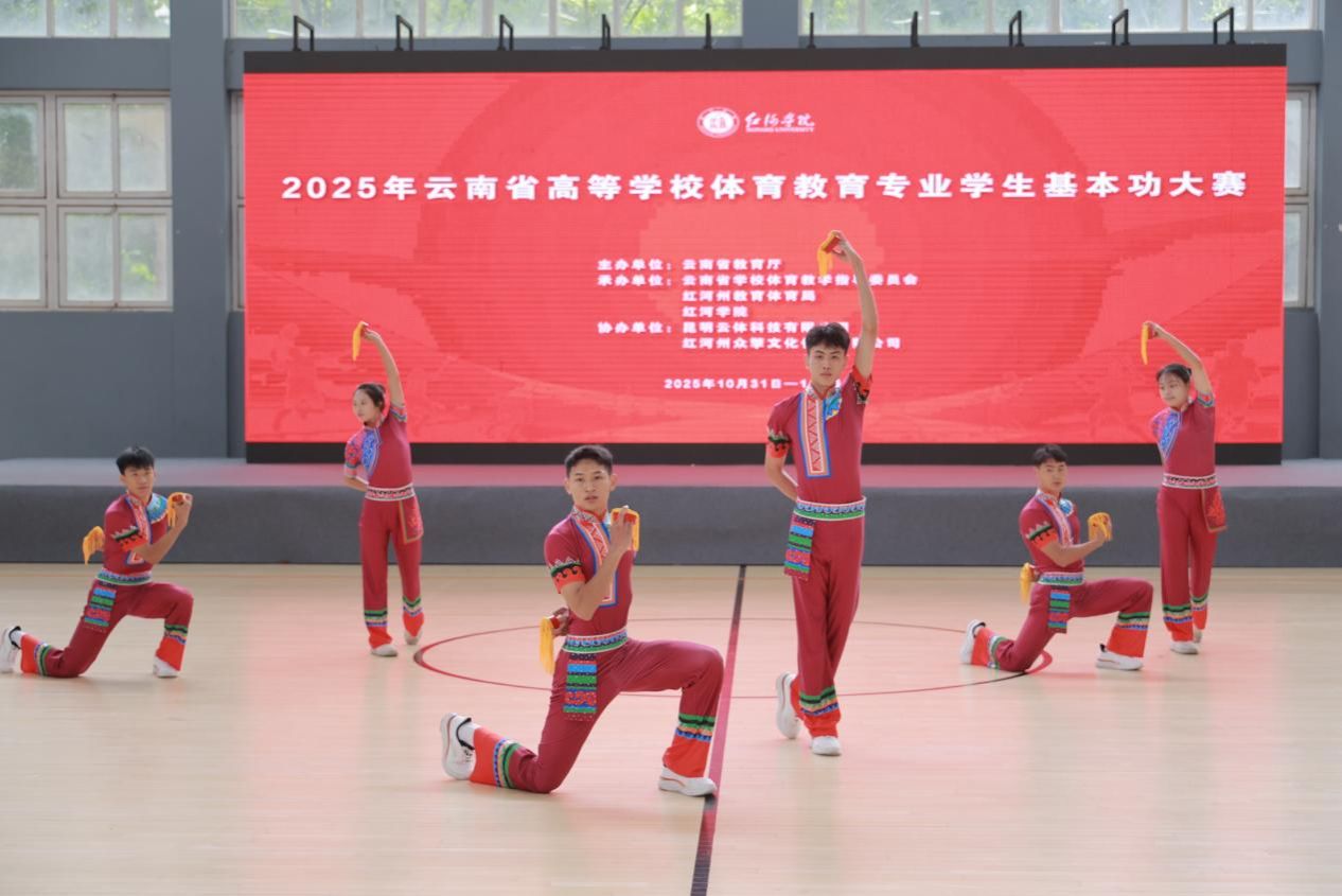 11月3日,由云南省教育厅主办,云南省学校体育教学指导委员会、红河州教育体育局、红河学院共同承办的2025年云南省高等学校体育教育专业学生基本功大赛在红河学院闭幕。本次比赛共有来自全省20所高校体育教育专业的120名学生同台竞技。