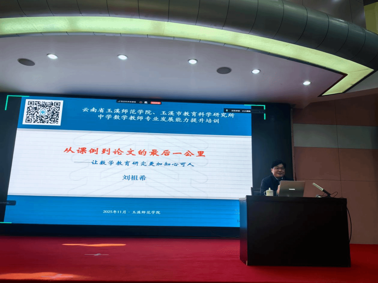 11月28日,玉溪师范学院数理学院主办的“中学数学教师专业发展能力提升培训”在图书馆多元学术报告厅举行。本次培训特邀中国教育学会青少年创新思维教育研究分会常务理事、全国数学科学方法论研究交流中心副秘书长兼学术委员会副主任、华东师范大学出版社编审刘祖希担任主讲专家。