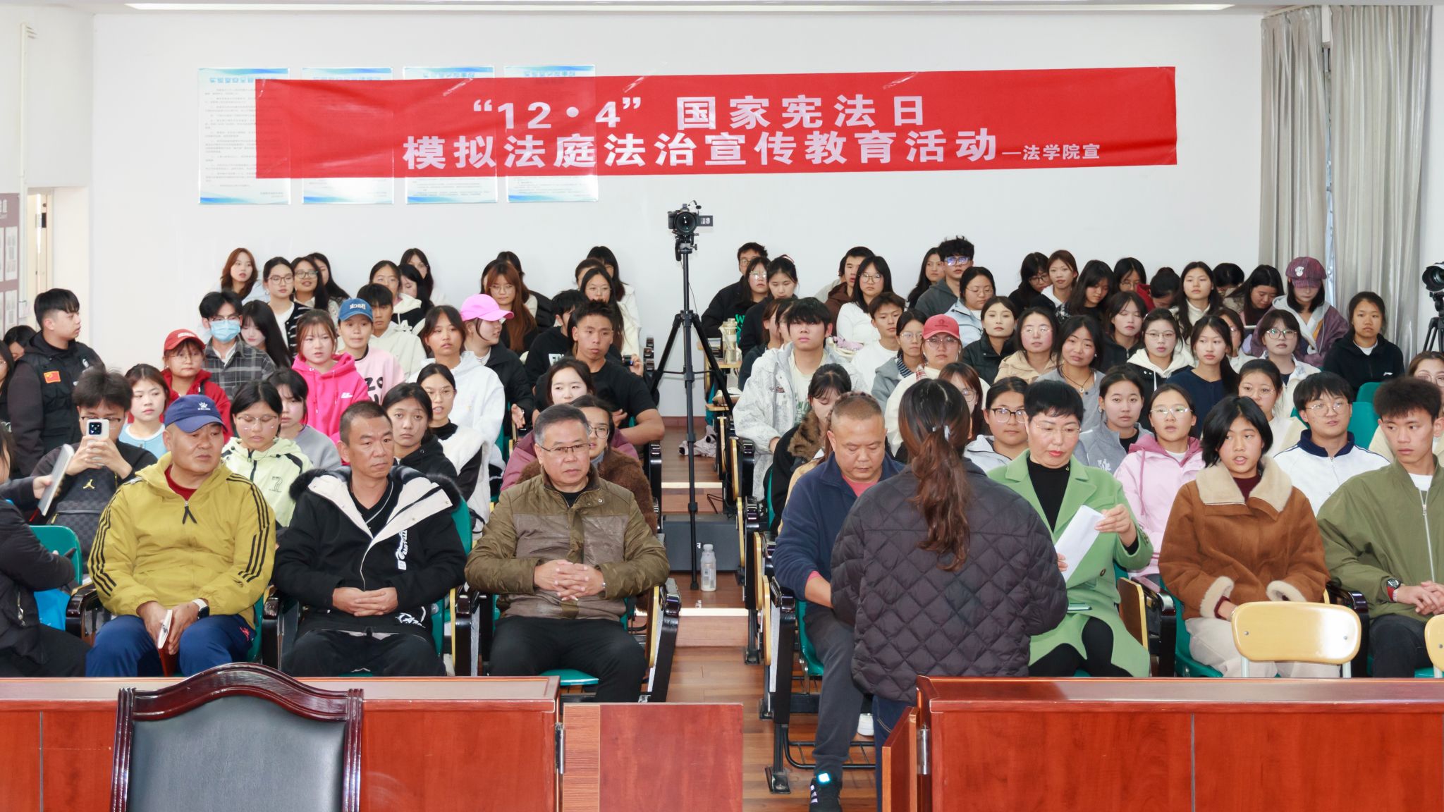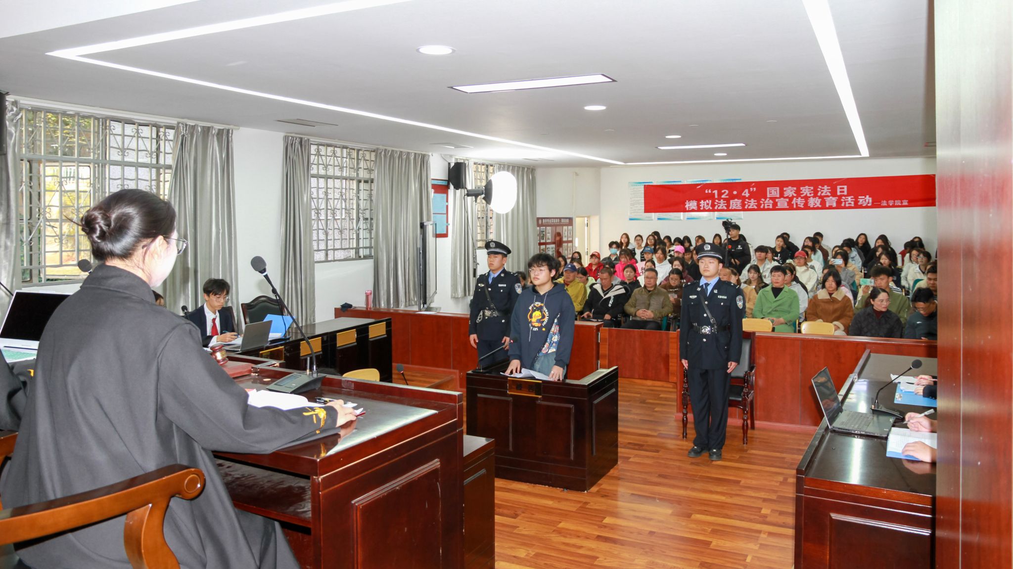 12月4日是第十二个国家宪法日,为加强宪法宣传教育,弘扬宪法精神,维护宪法权威,推动宪法实施,玉溪师范学院法学院在国家宪法日当天举行模拟法庭法治宣传教育活动。模拟庭审以一起引发广泛社会思考的“烧烤店伤害案”为背景,围绕法律定性展开激烈交锋。