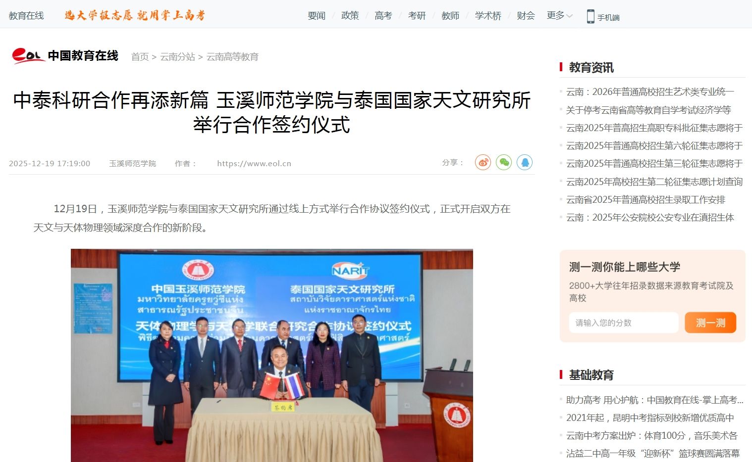12月19日,玉溪师范学院与泰国国家天文研究所通过线上方式举行合作协议签约仪式,正式开启双方在天文与天体物理领域深度合作的新阶段。