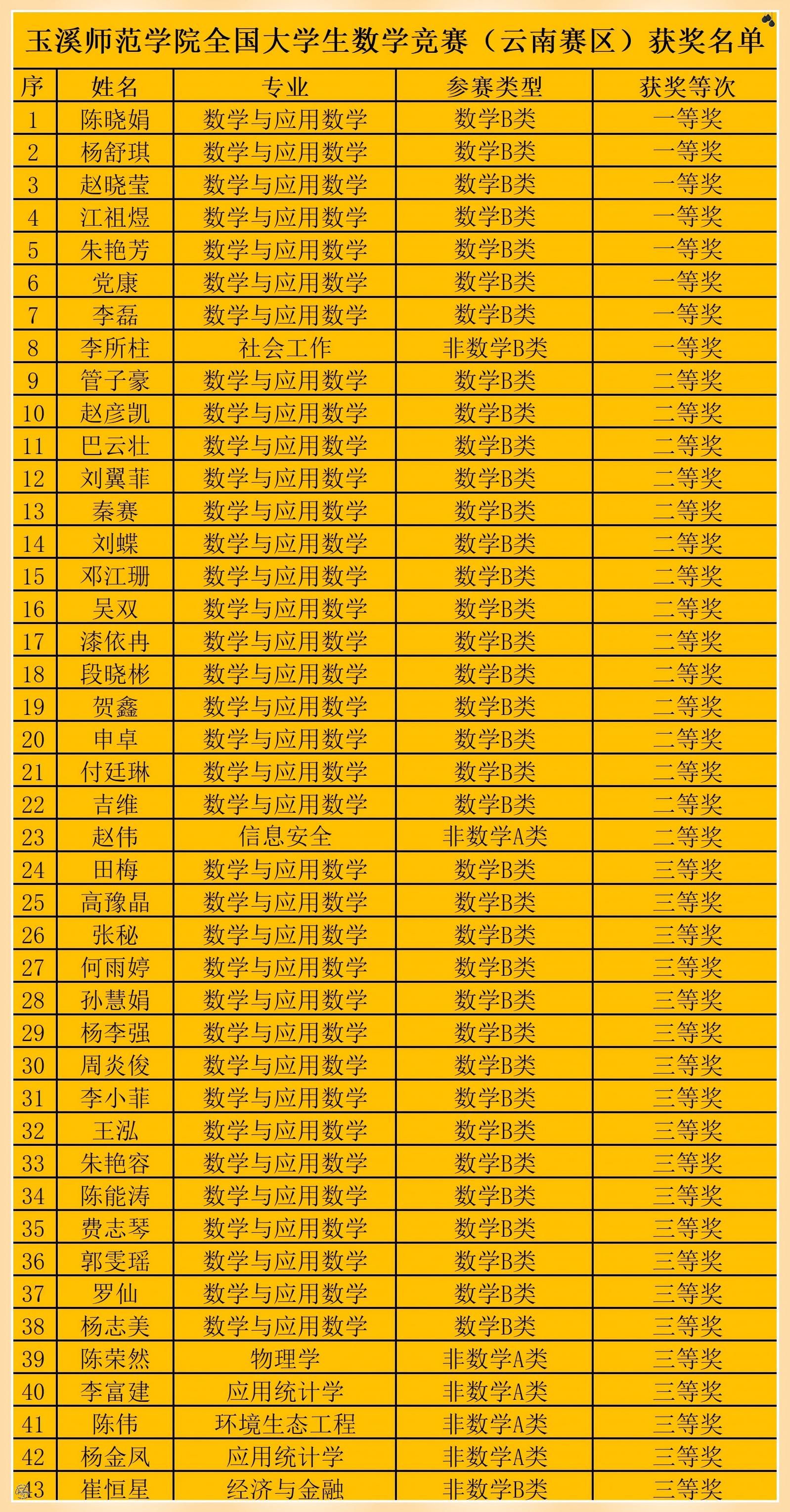 近日,第十七届全国大学生数学竞赛(云南赛区)成绩揭晓,玉溪师范学院学子表现优异,共有43名同学荣获佳绩,其中一等奖8人、二等奖15人、三等奖20人。本次比赛,我校共组织222名学生参赛,获奖总人数持续增长,在地州高校中位列前茅。
