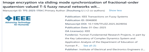 论文 Image encryption via sliding mode synchronization of fractional-order quaternion-valued T-S fuzzy neural networks with uncertain parameters 通讯作者为李周红教授,第一作者为云南财经大学孟晓芳副教授,合作者包括东南大学曹进德院士;论文 Quasi-projective synchronization of fractional-order quaternion fuzzy cellular neural networks with applications to image encryption 第一作者为李周红教授,合作者包括东南大学曹进德院士和云南财经大学孟晓芳副教授等。