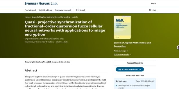 近日,玉溪师范学院数理学院教授李周红团队依托云南省教育厅复杂系统动力学与应用分析重点实验室开展研究,在复杂动态系统的同步控制方面取得系列进展,相关成果论文 Image encryption via sliding mode synchronization of fractional-order quaternion-valued T-S fuzzy neural networks with uncertain parameters 和 Quasi-projective synchronization of fractional-order quaternion fuzzy cellular neural networks with applications to image encryption 分别在模糊系统领域顶级学术期刊 (IEEE Transactions on Fuzzy Systems )和应用数学与计算领域权威期刊( Journal of Applied Mathematics and Computing )发表。