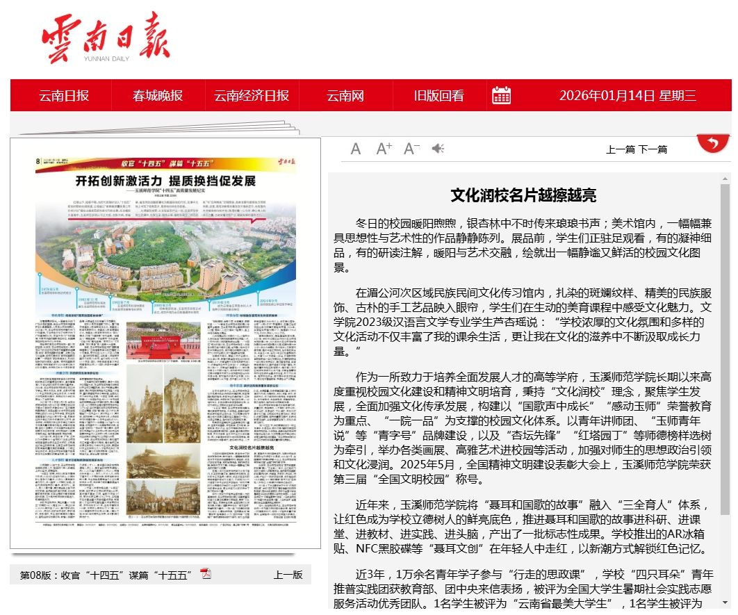 作为一所致力于培养全面发展人才的高等学府,玉溪师范学院长期以来高度重视校园文化建设和精神文明培育,秉持“文化润校”理念,聚焦学生发展,全面加强文化传承发展,构建以“国歌声中成长”“感动玉师”荣誉教育为重点、“一院一品”为支撑的校园文化体系。以青年讲师团、“玉师青年说”等“青字号”品牌建设,以及“杏坛先锋”“红塔园丁”等师德榜样选树为牵引,举办各类画展、高雅艺术进校园等活动,加强对师生的思想政治引领和文化浸润。2025年5月,全国精神文明建设表彰大会上,玉溪师范学院荣获第三届“全国文明校园”称号。