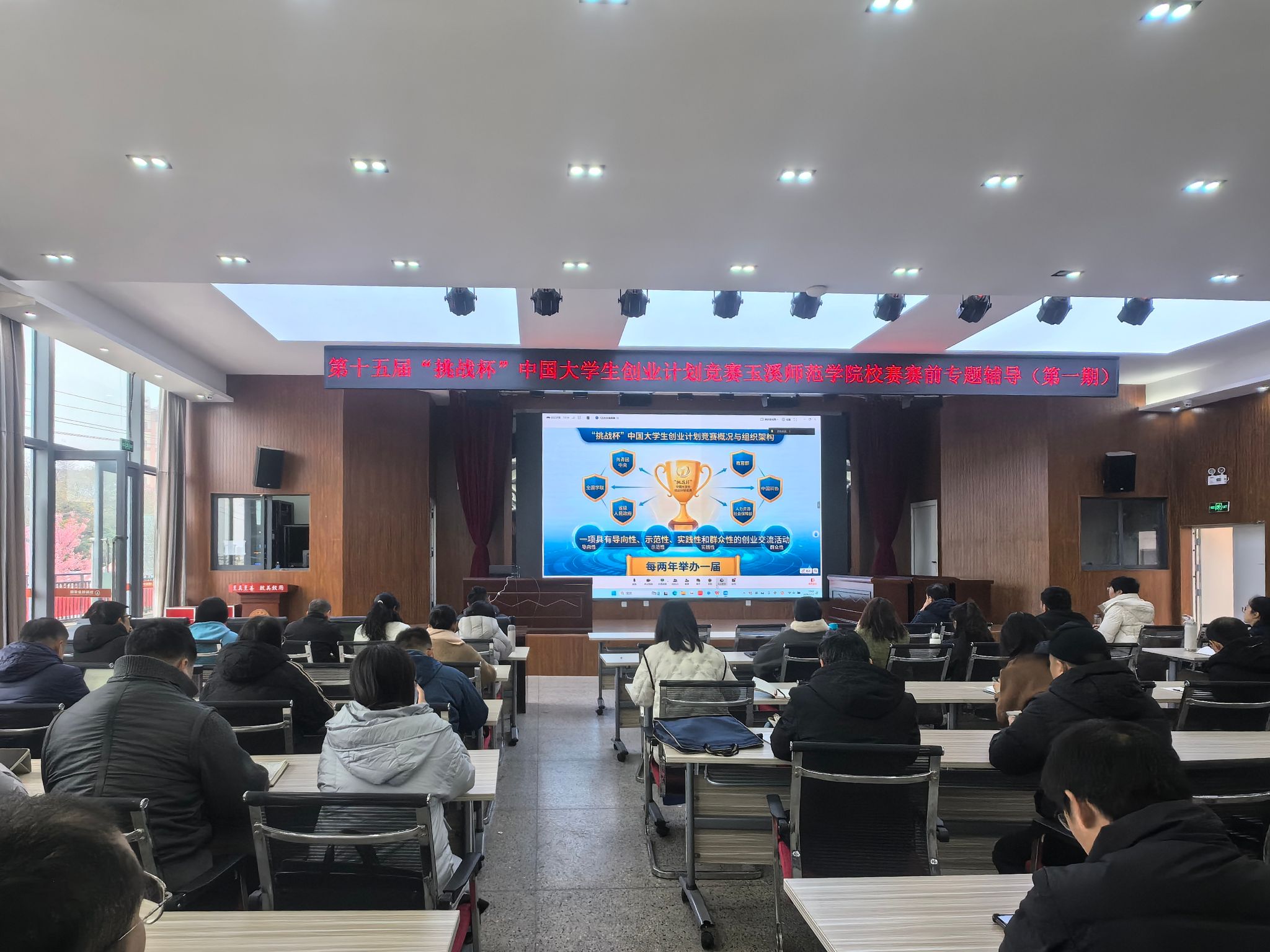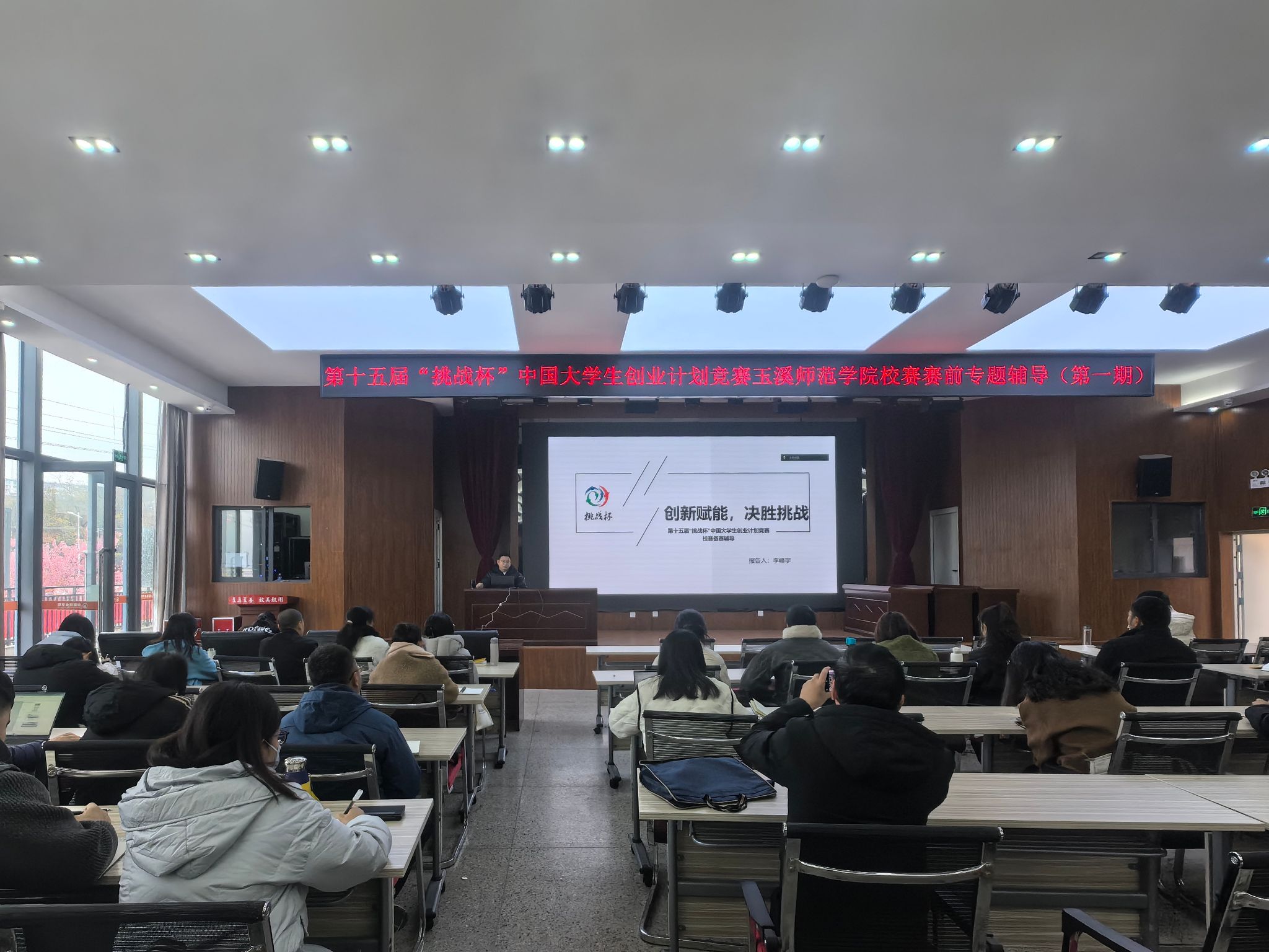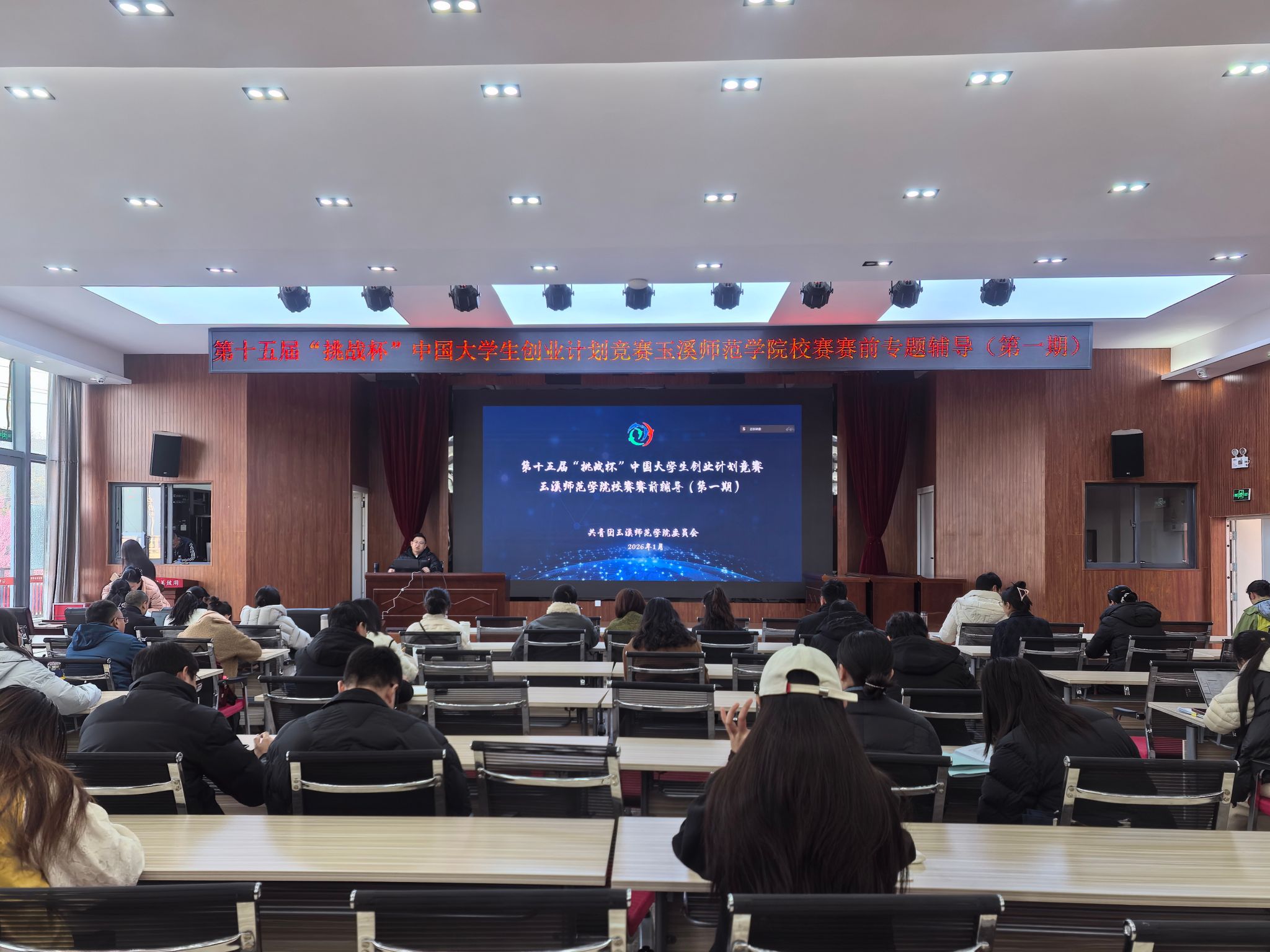 为做好第十五届“挑战杯”中国大学生创业计划竞赛玉溪师范学院校赛备赛工作,更好发挥“挑战杯”赛事育人,助力创新型人才培养,营造“以赛促练、以赛促学、以赛促创”的科创氛围,1月13日,第十五届“挑战杯”中国大学生创业计划竞赛校赛赛前专题辅导第一期在大学生活动中心学生会堂举行。校团委副书记李峰宇,“挑战杯”国赛指导专家作专题辅导。各学院创新创业工作分管领导、辅导员、团委书记、项目指导教师,校团委全体人员共90余人参加会议。