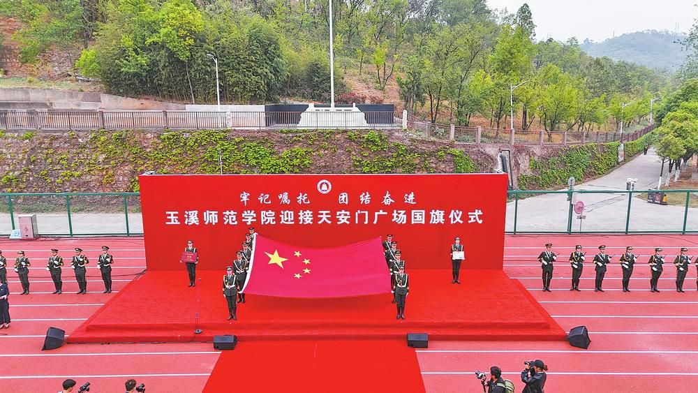 迎着清晨的阳光,一面曾在天安门广场升起的国旗,由玉溪师范学院国旗护卫队高高擎起,从师生头顶缓缓飘过。2025年3月,玉溪师范学院获赠天安门广场国旗,万名师生参加了迎接天安门广场国旗的仪式。来自天安门广场的国旗,与聂耳作曲的国歌相互呼应,爱国精神在年轻学子们心中传承。