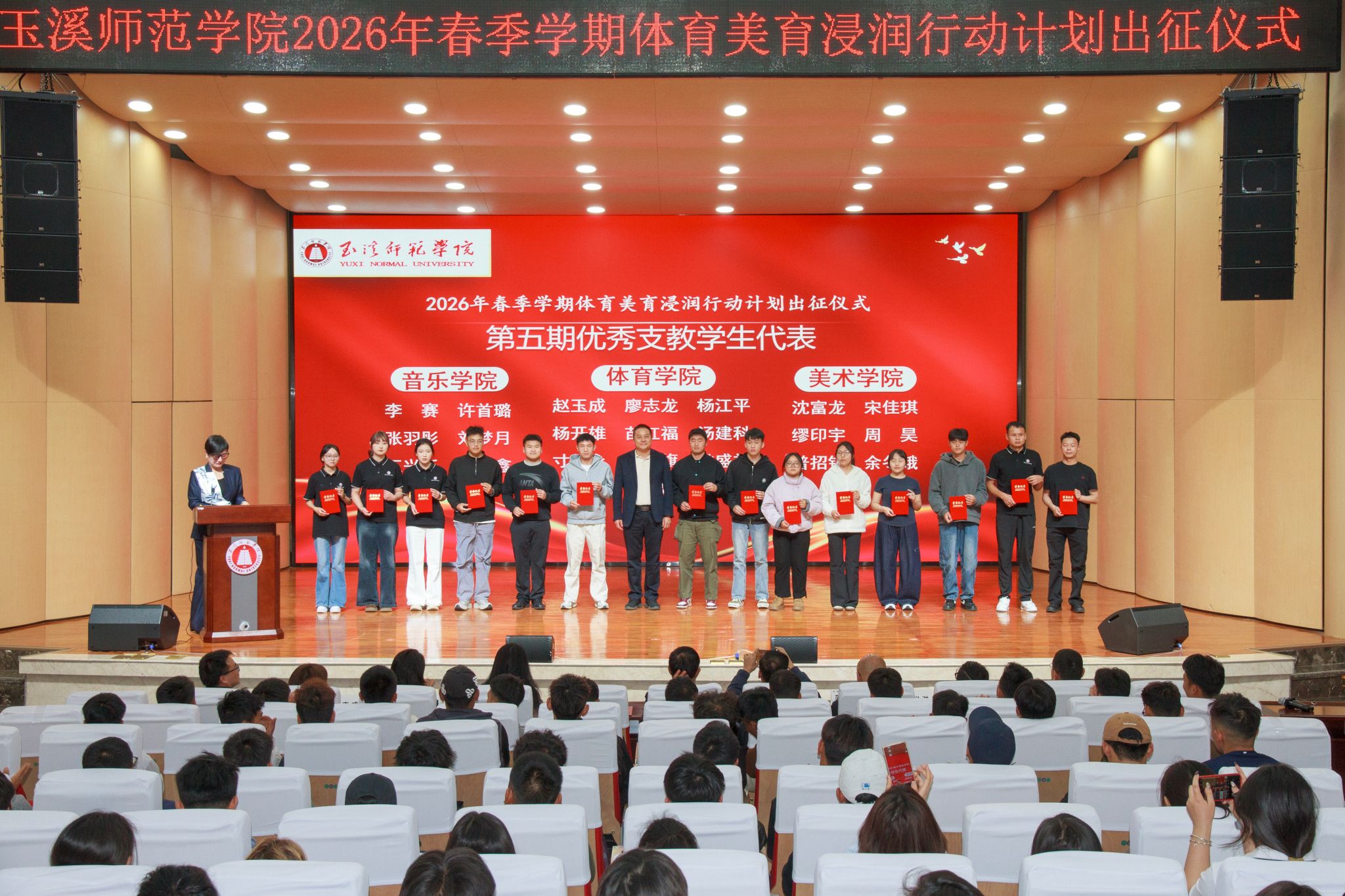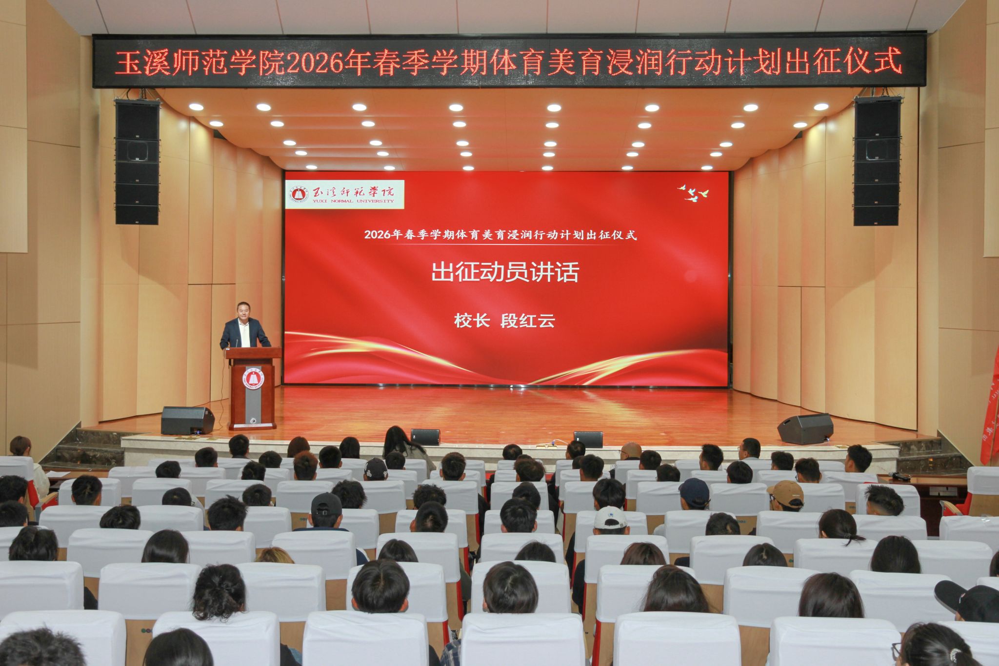 2月27日,玉溪师范学院为即将奔赴勐海县、勐腊县的驻点师生举行2026年春季学期第六期体育美育浸润行动计划出征仪式。校长段红云出席仪式并作出征动员与安全教育。