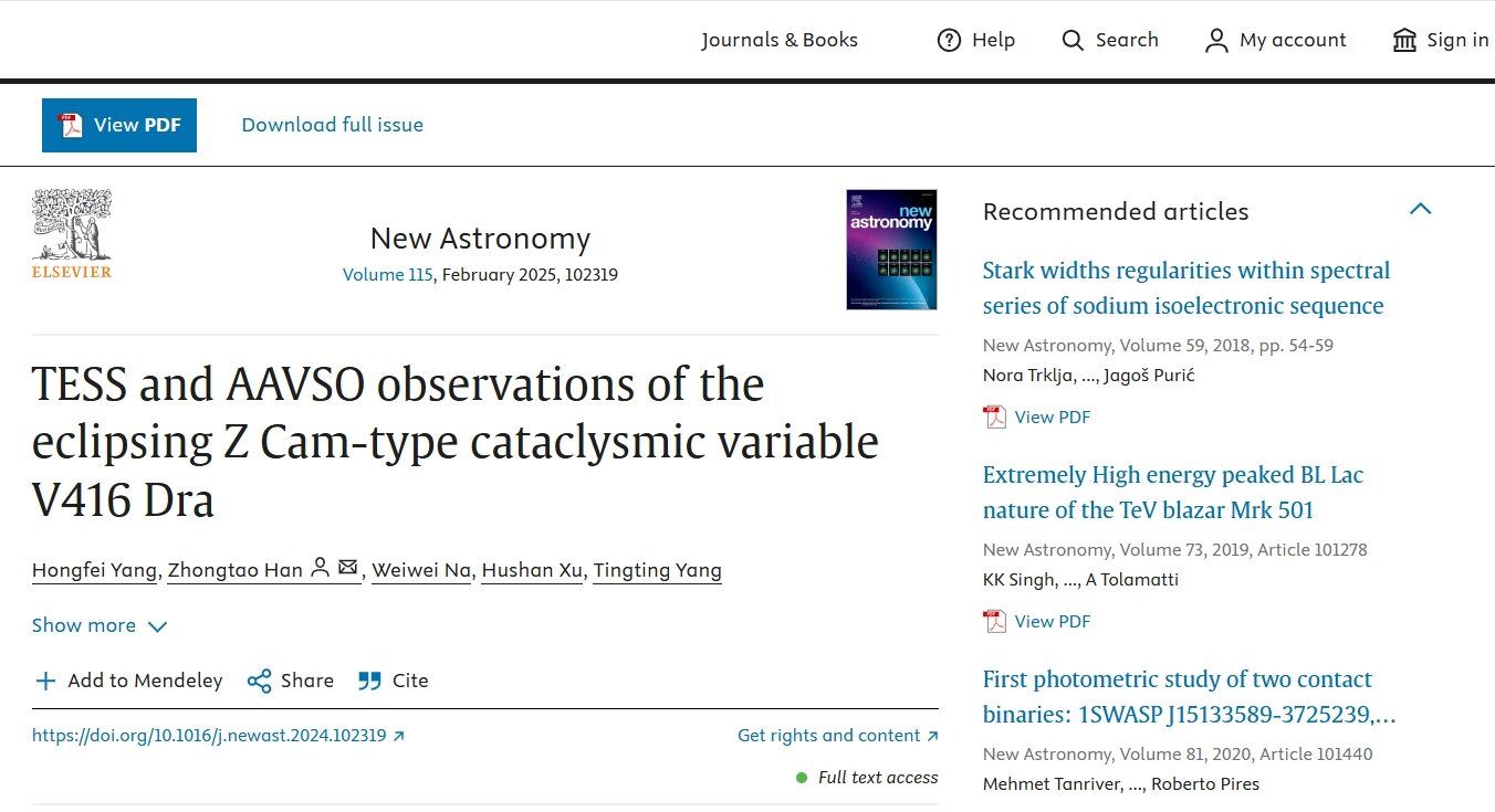 近日,玉溪师范学院数理学院教师韩忠涛副研究员带领团队在激变变星演化、吸积盘动力学以及系外行星探测等研究方向取得重要进展。相关研究成果论文(1) A Comprehensive Photometric Study of the Eclipsing SU UMa-type Cataclysmic Variable OY Carinae 在国际权威天文学期刊The Astrophysical Journal 发表;论文(2)TESS and AAVSO observations of the eclipsing Z Cam-type cataclysmic variable V416 Dra 和论文(3) Long-term orbital period variations and state transitions in the SW Sex-type cataclysmic variable V1024 Cep 在欧洲天文学期刊 New Astronomy 发表。