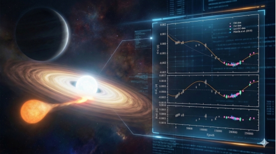 研究表明,该系统轨道周期存在显著长期变化,并叠加有约33年的周期性调制信号,这一信号大概率由一颗质量约11倍木星质量的第三天体所引发,暗示系统外围可能存在一颗巨行星。该成果为研究极端双星环境下的行星形成与演化提供了新的观测依据。