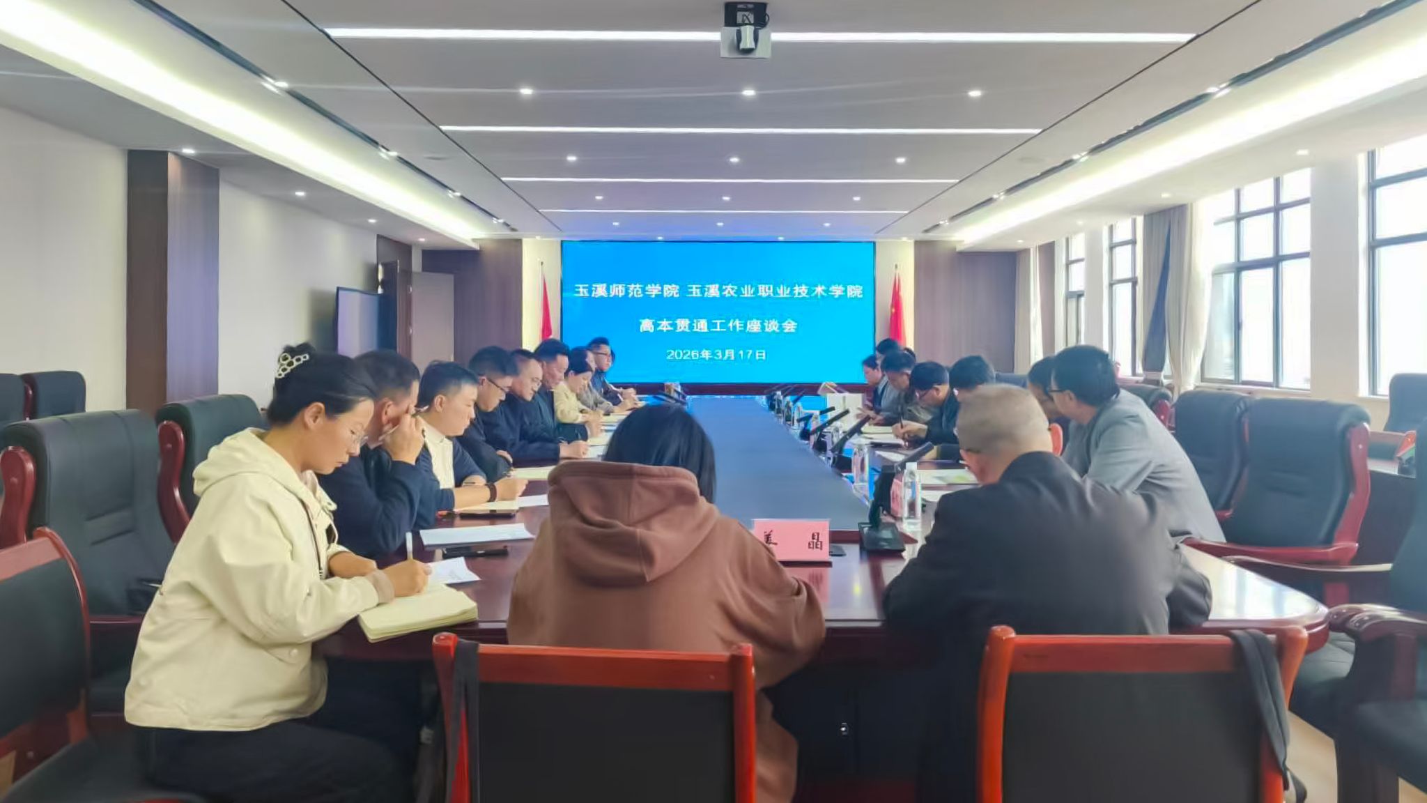 座谈会上,柏家渭详细介绍了该校办学特色、专业建设成效、高本贯通合作经验及下一步的合作规划,相关部门负责人就课程衔接、教学管理等具体工作及合作建议作补充说明。章新对玉溪农业职业技术学院的办学成效及高本贯通工作经验给予肯定,同时介绍了玉溪师范学院高本贯通项目整体规划,强调两校需进一步强化协同协作,聚焦课程衔接等核心难题,共同推动高本贯通人才培养提质增效。双方围绕人才培养方案优化、师资队伍共建、转段考核标准等核心议题深入研讨,达成合作共识。