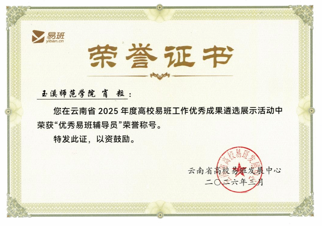 我校被评为2025年度云南省 “十佳易班共建高校”;学校易班工作案例《绿色同行・变废为宝废品回收志愿活动》获评“云南省优秀易班共建案例”;辅导员肖粒老师荣获“云南省优秀易班辅导员”称号;学校易班学生工作站站长王公恋同学荣获“云南省优秀易班工作站站长”称号。